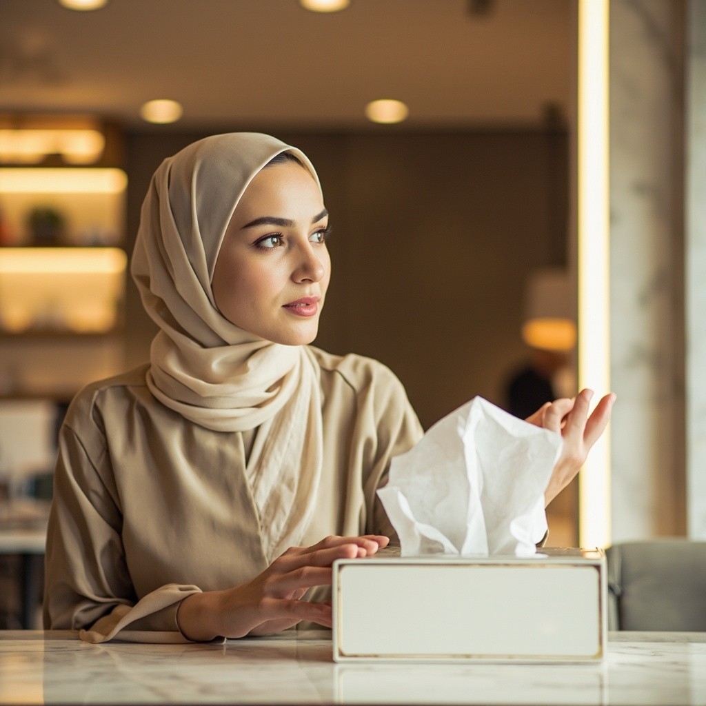 A high-quality, profile picture of a beautiful Gulf woman with soft, natural hair, without a hijab, sitting at an elegant marble table inside a modern, brightly lit store. She is pulling a soft white tissue from a luxurious, minimalist tissue box. The lighting is soft and warm, the background is professionally blurred to highlight the product, and the realistic photographic style makes it suitable as a backdrop for an online tissue store. It features high resolution, sharp details, and calm, luxurious colors.