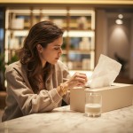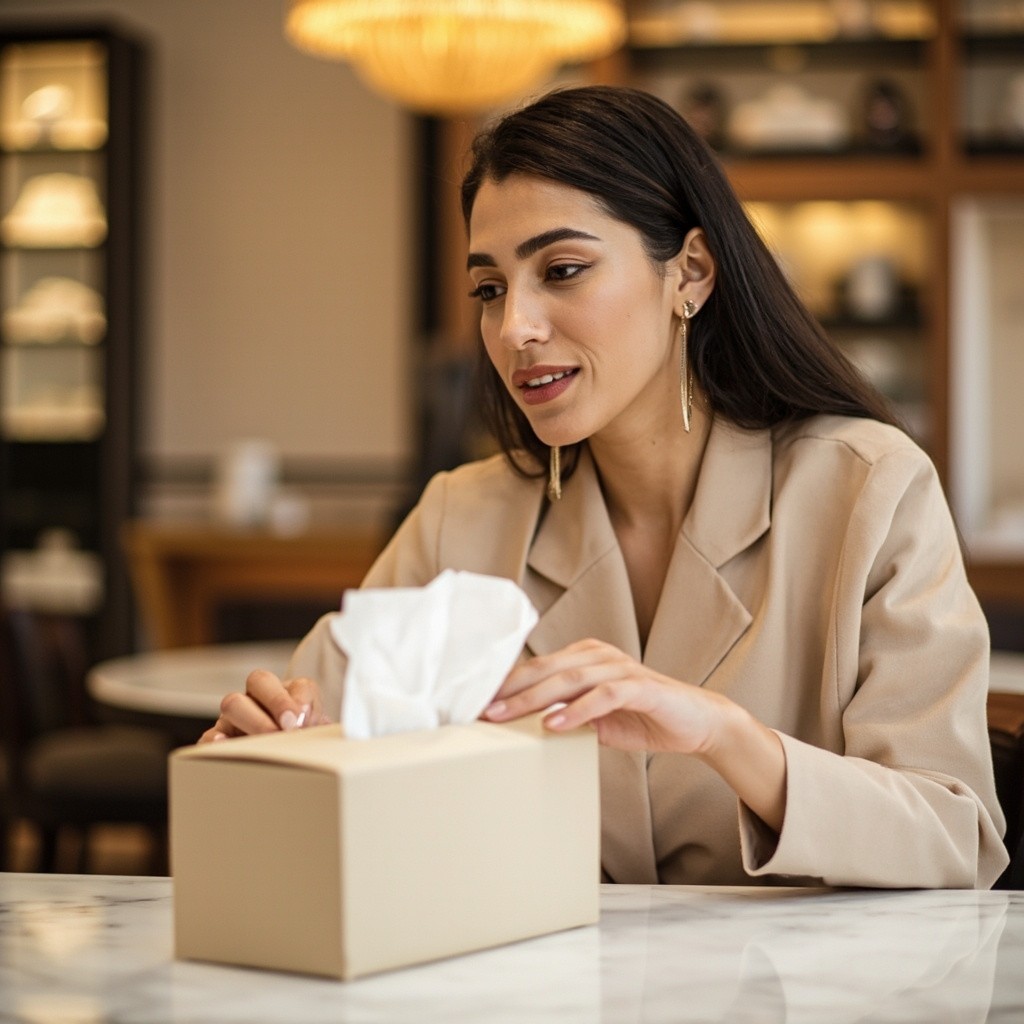 Gulf Woman Pulling Tissue from Box at Marble Table in Modern Store
