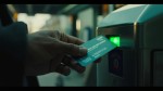 Create an image in 16:9 landscape format. Close-up of a realistic human hand holding a London Underground card and swiping it through a metal contactless payment terminal, the kind used in Tube stations that swipe the card from the top and have turnstiles after validating the payment. The machine has a polished steel surface and a bright green light indicating a successful payment. Only the hand and scanner are visible, not the face or body. The setting is urban and modern, with soft ambient lighting. Shot in a cinematic style, with slight handheld camera shake and great detail.