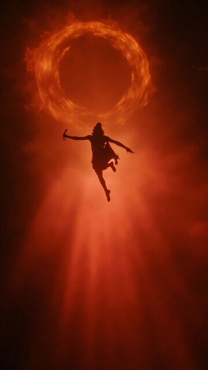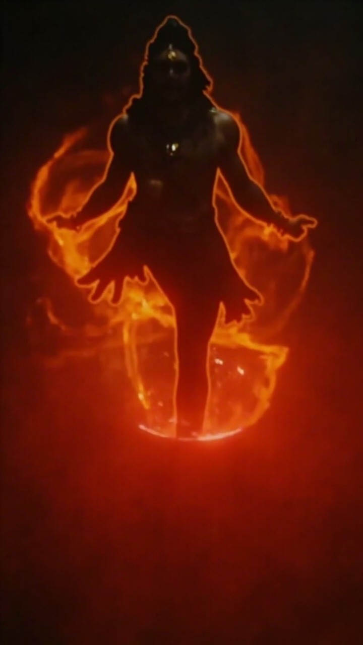 --SHOT START-- [Time Segment]: 40–45 sec Scene Description: Dark Patाल लोक, fiery shadows. Action: Hanuman Ji leaps across realms. Characters: Hanuman Ji. Dialogue (VO): “छठी सिद्धि— प्राकाम्य।” “कहीं भी जाने की शक्ति।” Camera Angle & Motion: Dynamic tracking shot. Lighting: Red-orange underglow. Mood/Tone: Dark fantasy, intense. Effects: Portal energy swirls. Consistency Instructions: Aura adapts to environment. --SHOT END--