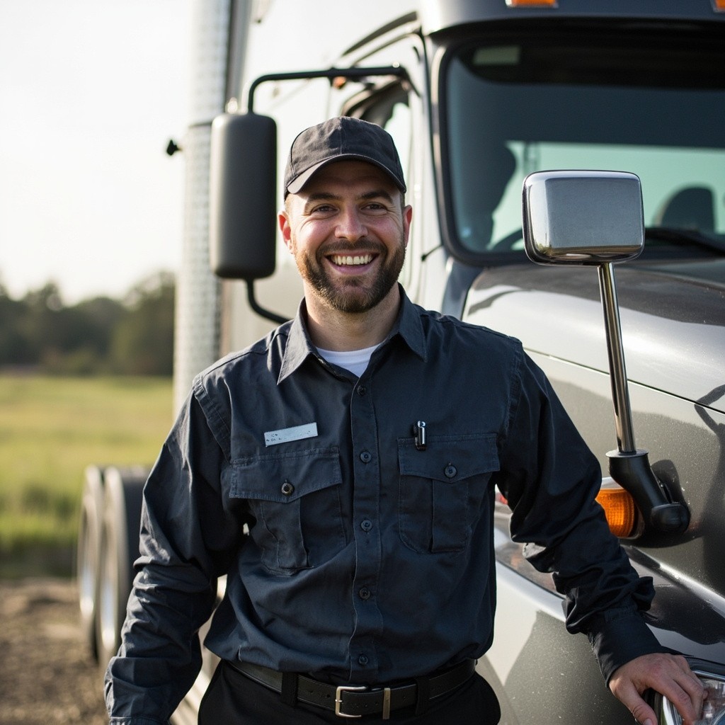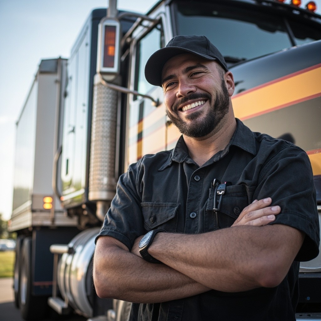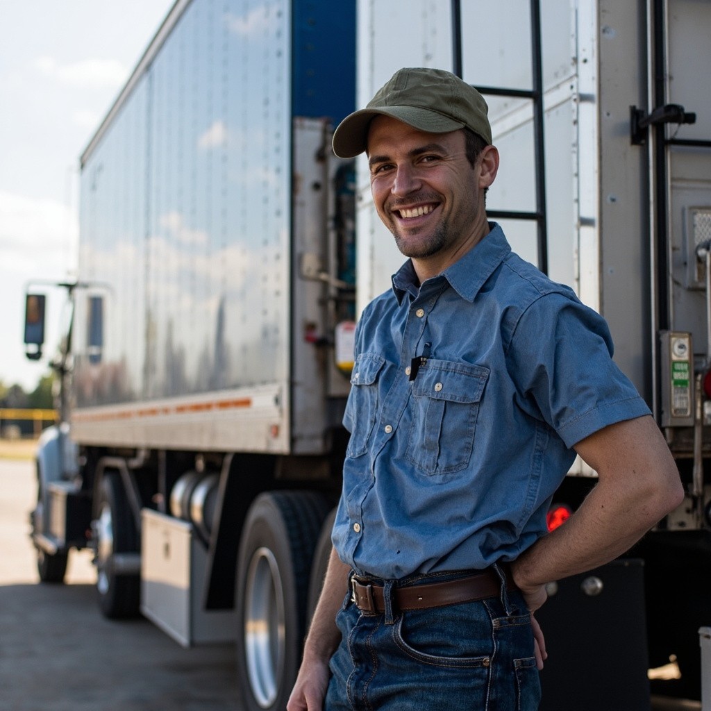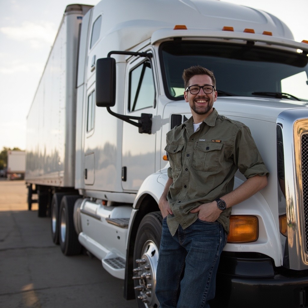 Happy Truck Driver Standing Next to Truck