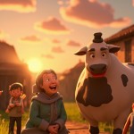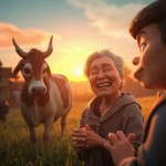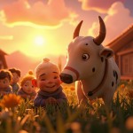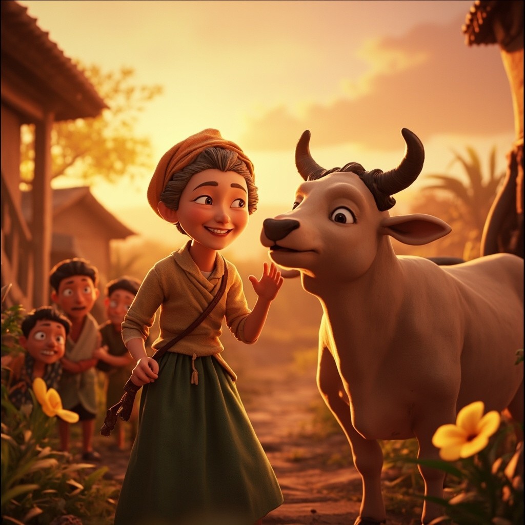 Happy Village Scene with Smiling Old Woman and Magical Cow at Sunrise