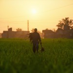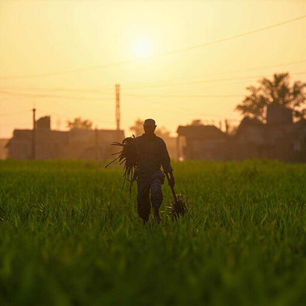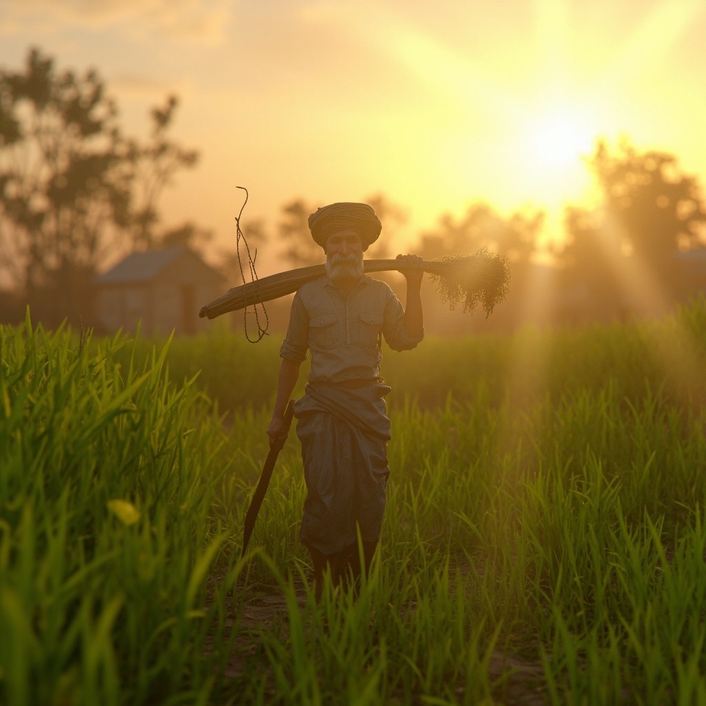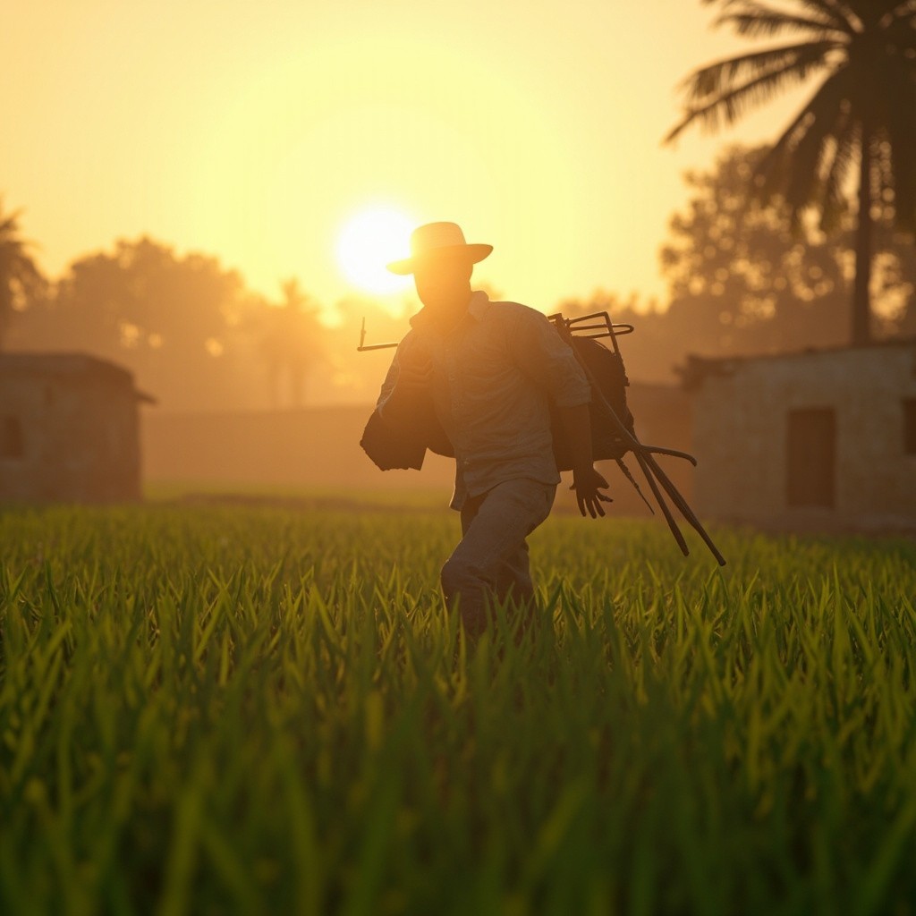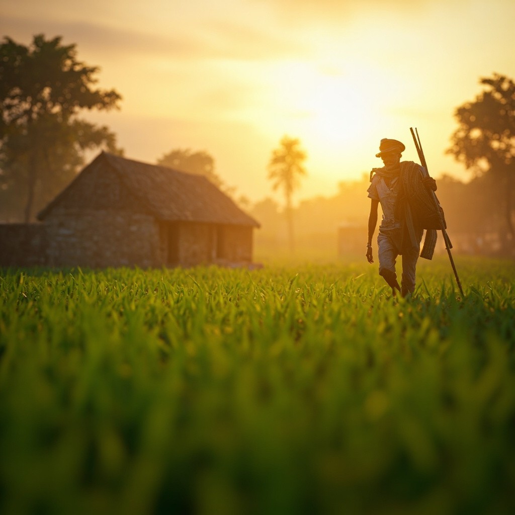 3D Rural Indian Village at Sunrise with Farmer and Green Fields