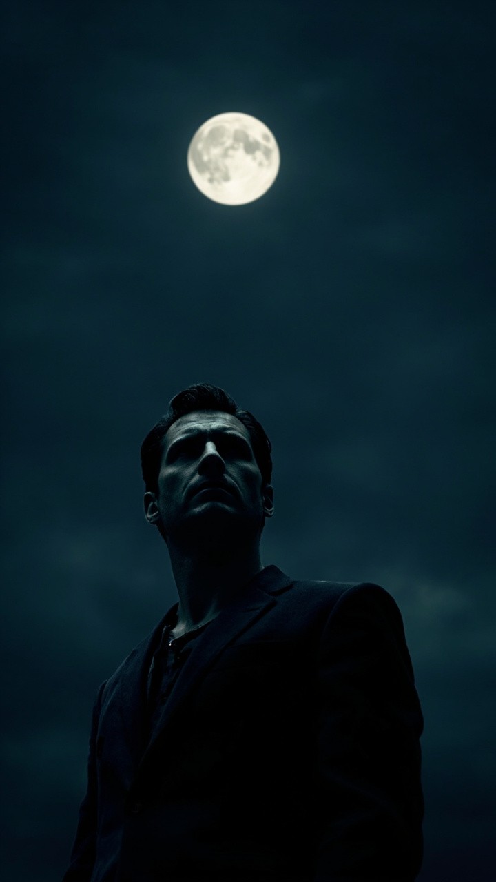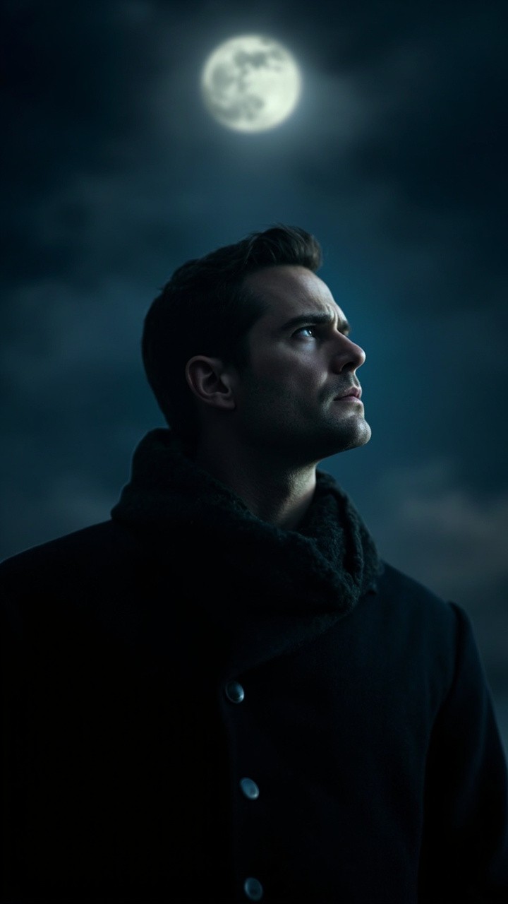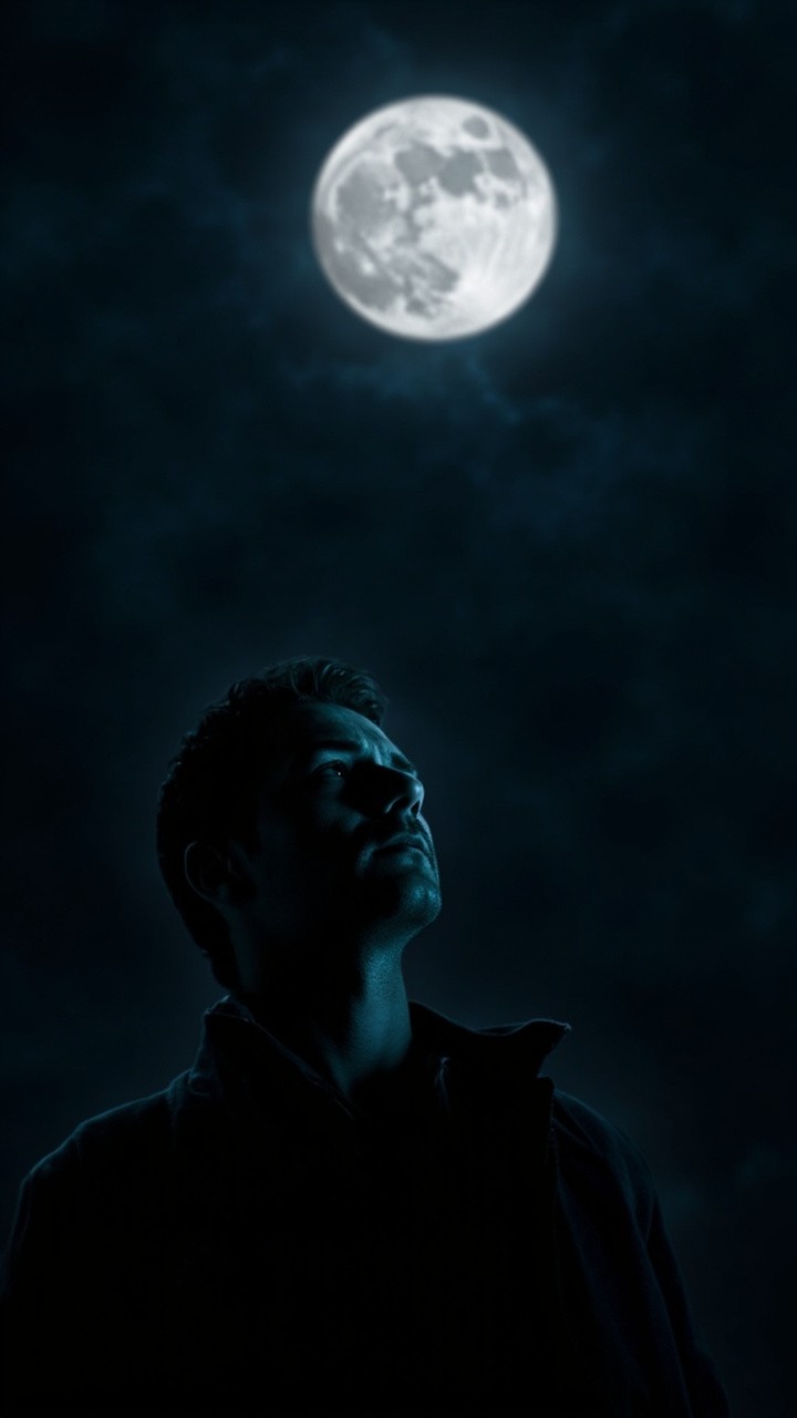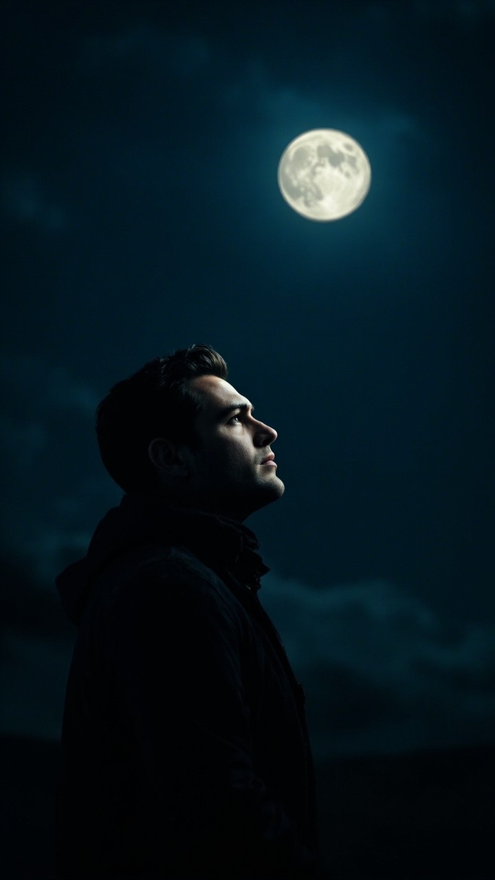 Handsome Man Looking Up at Moon in Darkness