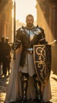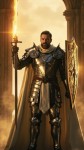 heroic paladin man in shining silver armor, standing tall with a glowing sword and ornate shield, golden sunlight beaming behind him, white cape flowing, intricate armor engravings, medieval fantasy setting, cathedral ruins in the background, cinematic lighting, ultra-realistic, shot on ARRI Alexa, 16:9