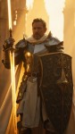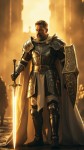 Heroic Paladin Man in Shining Armor with Glowing Sword and Shield in Cathedral Ruins Setting