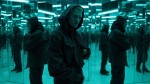 Stone island fashion campaign colour photoshoot, full length, white male model looking directly at the camera with attitude, multiple mirrors, multiple reflections, mirrored corner set, meticulously crafted scenes, soft sculpture, embodying the ethos of high-end fashion,, black and blue green colour scheme. high fashion photography, editorial aesthetic, The model is shown wearing an urban technical jacket, hood down, in the style of high fashion photography Envision an editorial-style composition, dynamic lighting, dynamic lighting, in the style of Hasselblad, high definition, skin detail, using a wide-angle lens at f/2.8, the scene is illuminated by cinematic lighting, resulting in an ultra-realistic depiction.