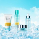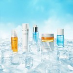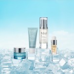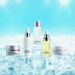 Elevated Shot of Skincare Products on Ice with Sky Backdrop