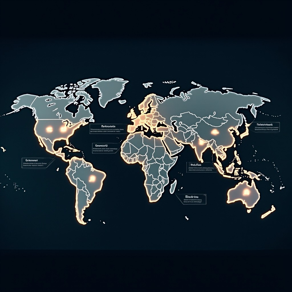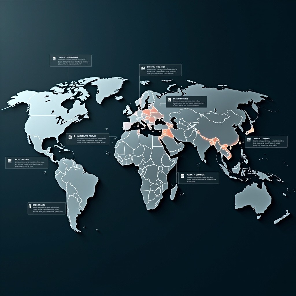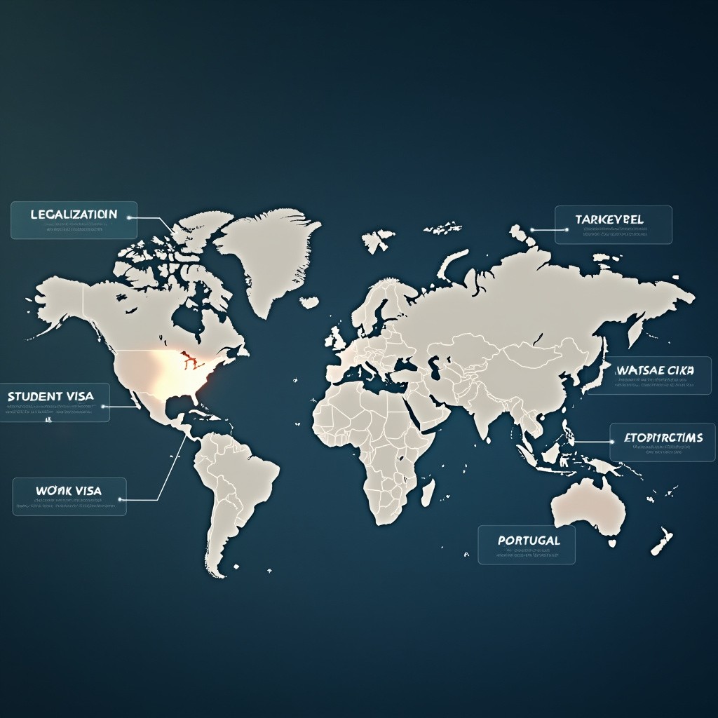 A modern, high-quality world map with a clean, professional design. Highlight Turkey, Malaysia, Cyprus, Germany, and Portugal in distinct glowing colors while the rest of the map remains muted. Each highlighted country has minimal infographic-style icons and labels representing migration requirements: document legalization, academic document verification, student visa, work visa, residence permit, embassy stamps, and international migration pathways. Use sleek lines connecting the countries to floating text panels with keywords like “Legalization,” “Academic Documents,” “Student Visa,” “Work Visa,” and “Migration Process.” The overall style is corporate, educational, and trustworthy, suitable for a migration consultancy video. Soft lighting, smooth gradients, 4K resolution, cinematic framing, professional typography, no clutter, global migration theme.