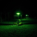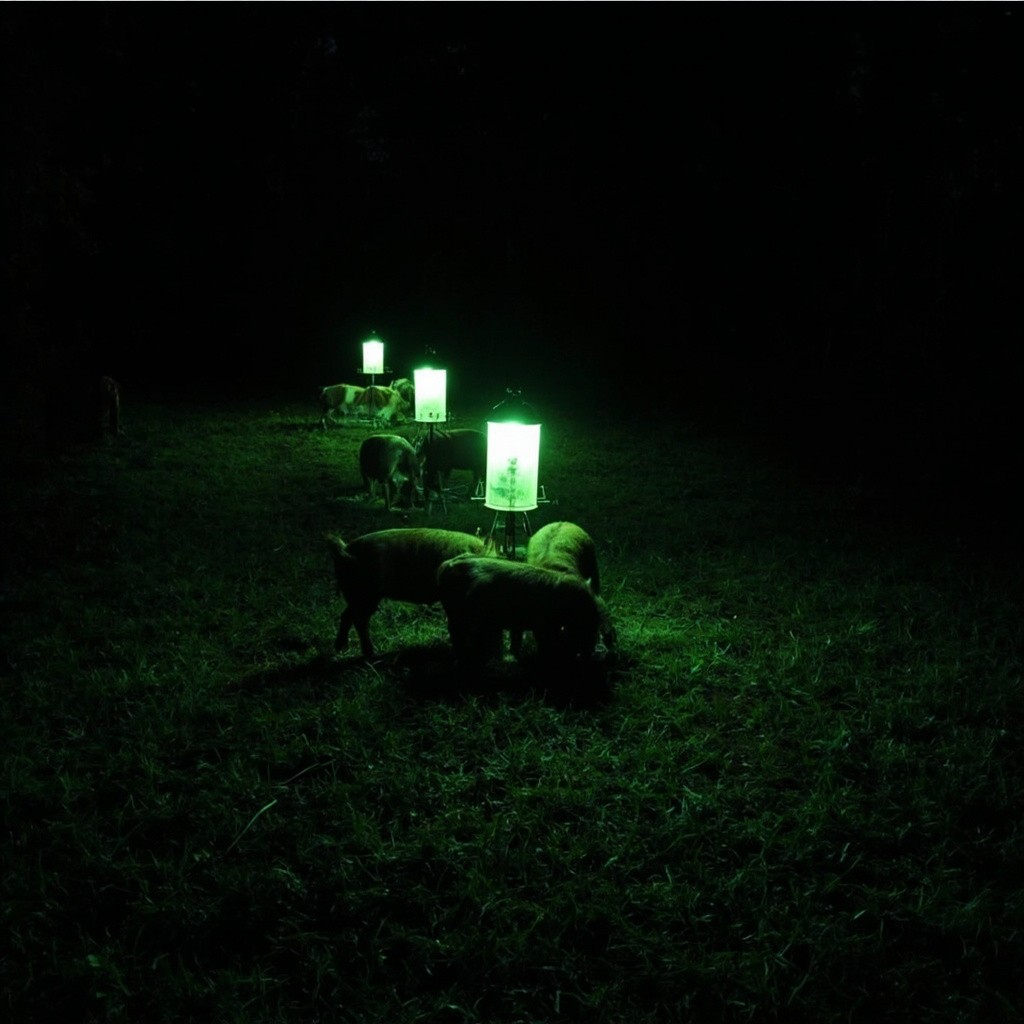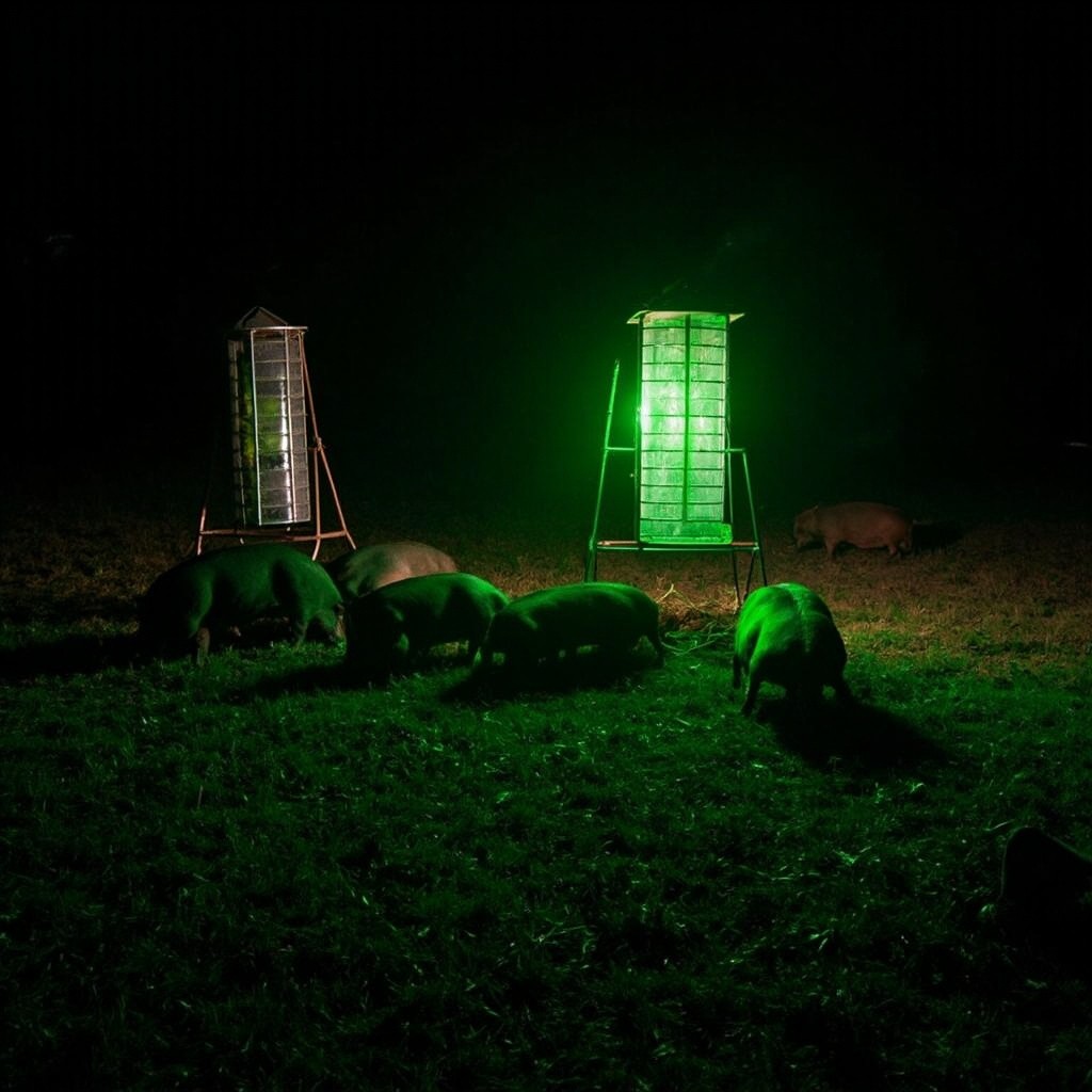 Night Scene of Hogs Eating Under Green Feeder Light