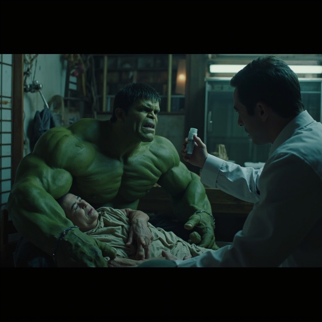 Hulk Comforting Sick Mother in Asian Village House Interior Prompt 🎬 AI VIDEO PROMPT (Scene by Scene – English) Scene 1: Sick Mother Prompt: A poor Asian village house interior, Hulk sitting beside his sick mother on a small bed, mother looking weak, emotional atmosphere, low light, cinematic close shot, realistic style Scene 2: Doctor Advice Prompt: A small clinic in an Asian town, doctor seriously talking to Hulk, doctor pointing toward medical prescription, Hulk looking worried and helpless, cinematic lighting