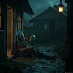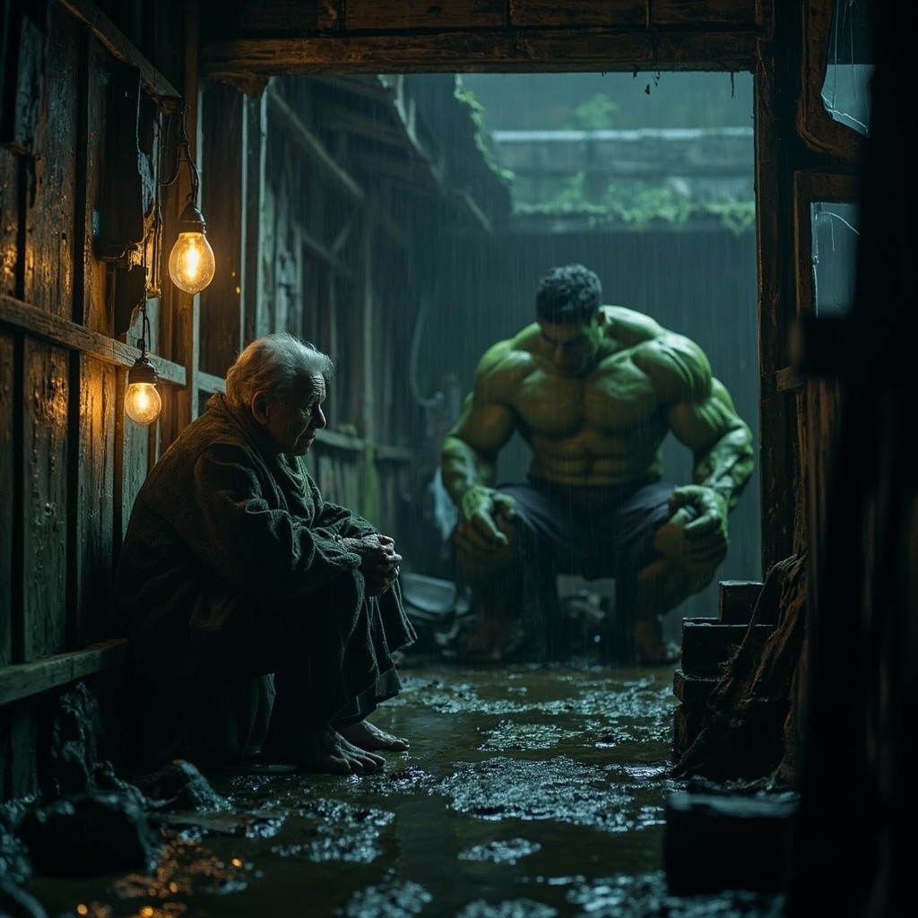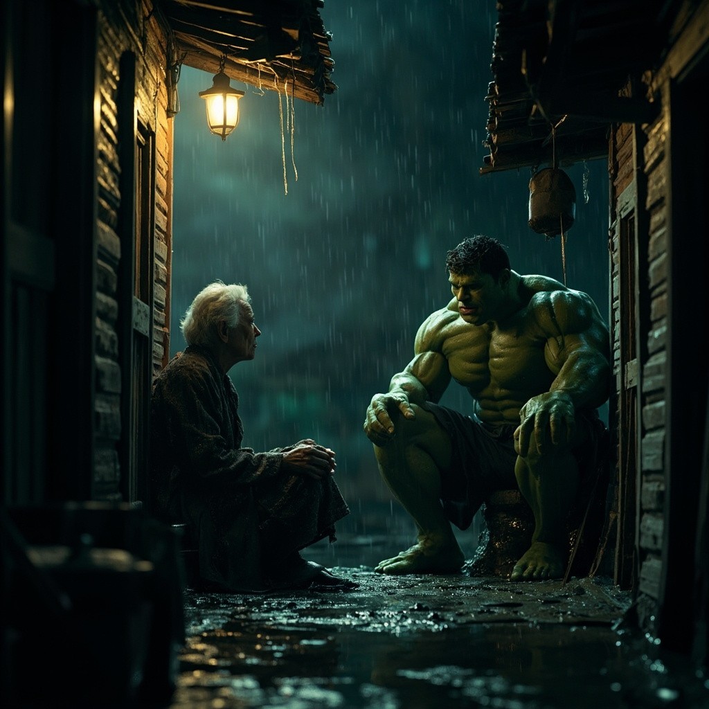 Heavy Rain Night Scene: Old House, Worried Grandmother, and Hulk Sitting