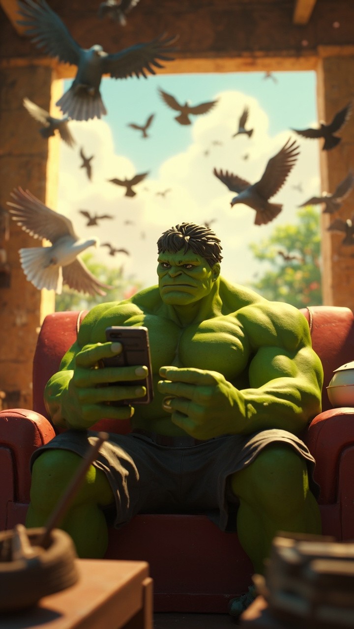 Hulk ghar me Beth ke free fire khel rha hota hai to use papa khte hai hulku re din bhar ghar me Beth ke free fire khelta hai re de Re sare kabutar khet ki fasal ko khaa rhe hai re jaa re unko bhaga re hulku khaita thik hai re papa re mai jata hu re in kabutro ko bhagata hu re fi hulku khet me jata or kabutro ko bhagata hai lekin sare kabutar mil kar hulku ko Marne lagte hai to hulku kheta hai papa re bacha le re ye kabutar to meri jaan le lenge re fir hulku ka papa ghar me se ek danda Lata hai or sare kabutro ko bhaga deta hai Prompt: "3D animation, Pixar style. A funny version of Hulk sitting on a small sofa in a humble Indian house, intensely playing Free Fire on a smartphone. He looks concentrated, thumbs moving fast. Vibrant colors, cinematic lighting."