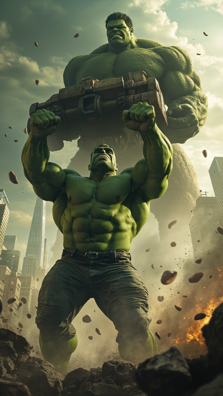 Hulk Lifting Monster in Destroyed City, Dramatic Perspective