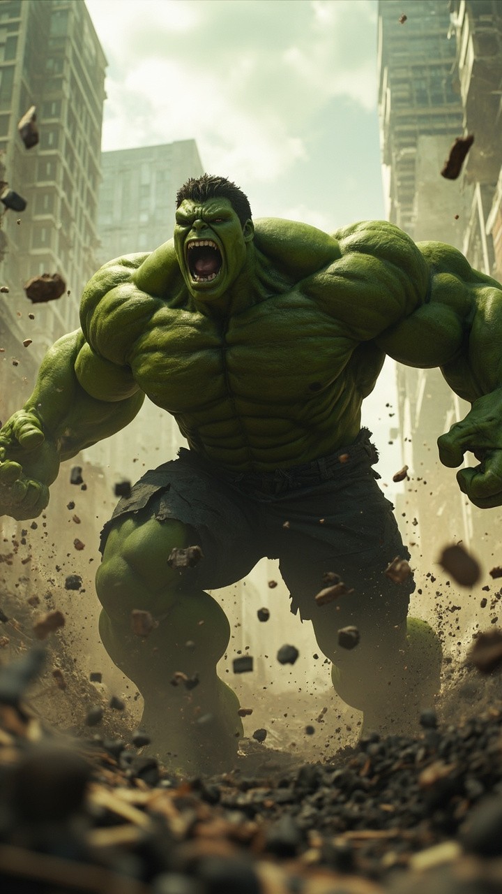 Muscular Hulk Roaring Amidst Destroyed City, Aggressive Pose