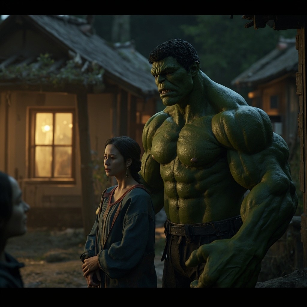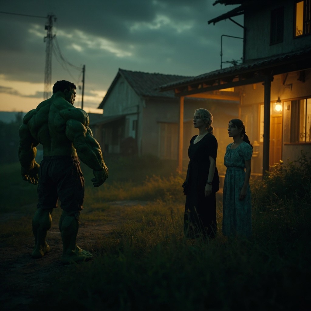 realistic cinematic village scene where a muscular bodybuilder Hulk lives peacefully with his mother and sister. One evening, Hulk’s mother becomes worried because his sister has not returned home from school. Emotional atmosphere, rural house environment, worried mother, cinematic lighting, realistic 4K quality.