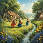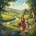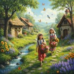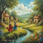 تخيل مشهدًا طبيعيًا ساحرًا في قرية هادئة، حيث تمتد مروج خضراء واسعة تتناثر فيها أزهار ملونة بألوان زاهية مثل البنفسج، والخزامى، وعبّاد الشمس. تنساب جداول مياه صافية بين المروج، تنبع من نهر هادئ تحيط به أشجار باسقة تتمايل أوراقها مع نسمات الريح العليلة. في الأفق، تظهر بيوت قروية جميلة بُنيت من الطين والحجر، ذات أسقف مغطاة بالقش أو القرميد الأحمر. تتخللها نوافذ خشبية صغيرة عليها ستائر بيضاء ترفرف، وحولها أواني فخار مزروعة بالنعناع والريحان. تتراقص فراشات ملونة في الهواء، تطير حول الأزهار برقة كأنها ترسم لوحاتٍ حية في السماء. وفي قلب هذا المشهد، تظهر فتيات قرويات بملابس تقليدية مزركشة، يسرن بين الزهور حاملات سلالاً من الورد والثمار، ووجوههن مشرقة بالابتسامة