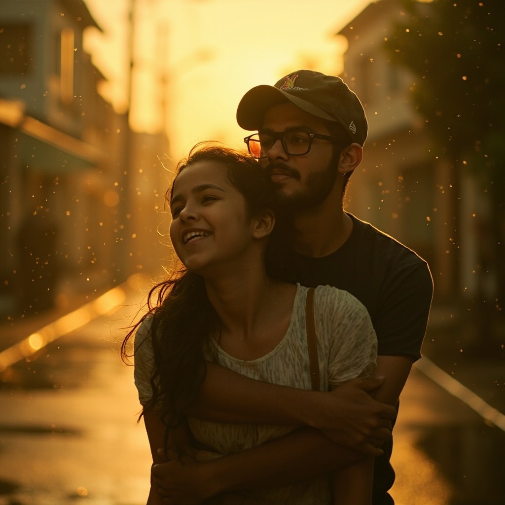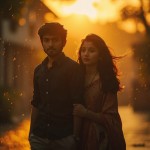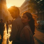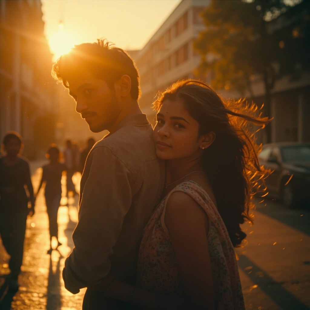 A young Indian boy slowly walking behind a girl on a rainy college campus evening, soft golden sunset light, slow motion scene, emotional romantic atmosphere, light wind moving her hair, cinematic camera movement, shallow depth of field, 4K ultra HD, dreamy background blur, soft piano music vibe, realistic expressions, Bollywood movie style, high detail, dramatic lighting, romantic mood