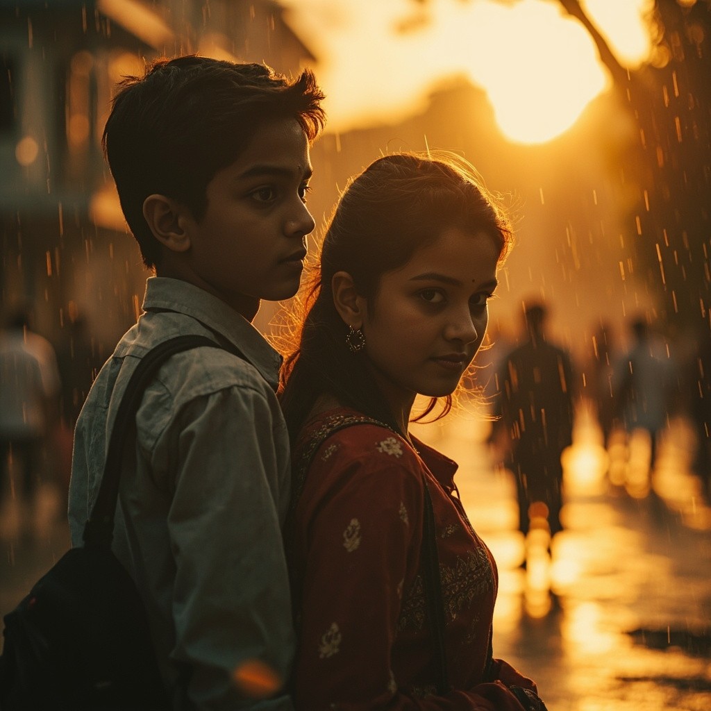 Young Indian Boy Walking Behind Girl in Rainy College Campus at Sunset