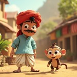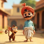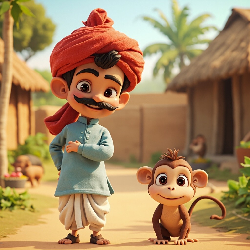 “Cute 3D cartoon style characters. A kind Indian farmer wearing a white dhoti, light blue kurta, red turban, black mustache, friendly face. A small brown mischievous monkey with big eyes and long tail. Bright colorful village farm environment, Pixar style cartoon, soft lighting, high detail, consistent characters.”