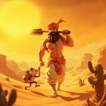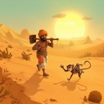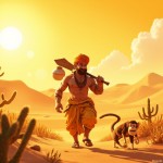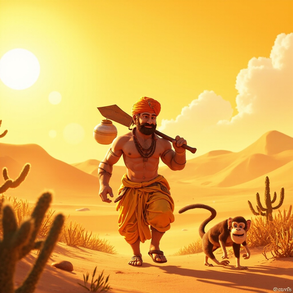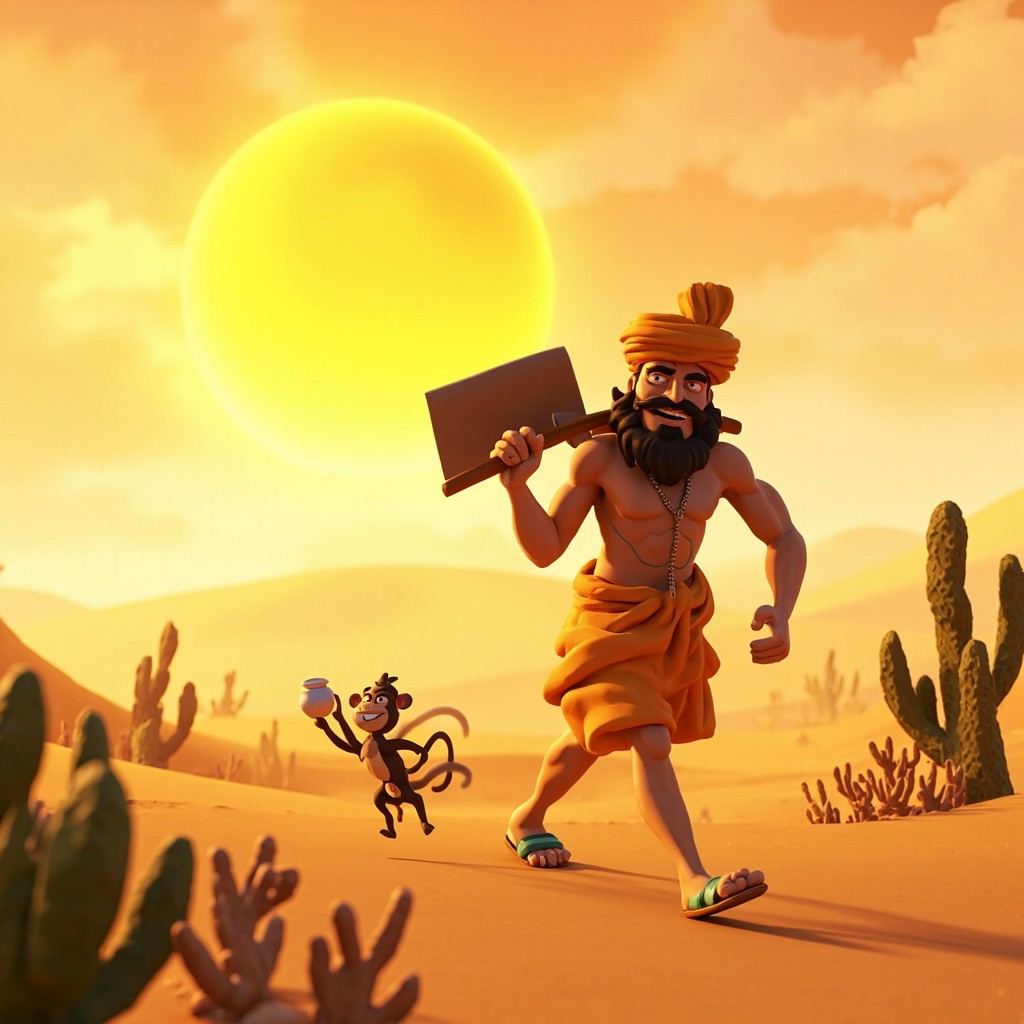 3D Cartoon of Indian Farmer and Monkey in Desert Landscape