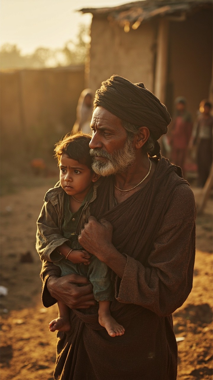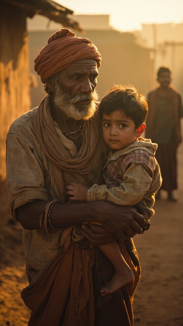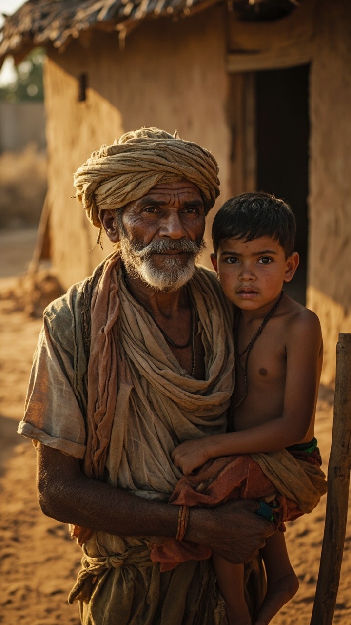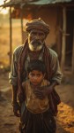 Indian Farmer and Son in Rural Village under Golden Sunlight