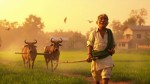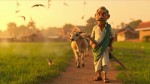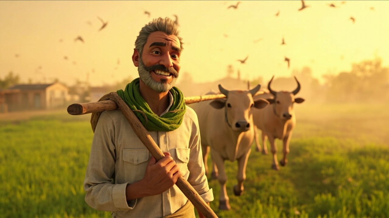 A peaceful Indian village at sunrise, Ramlaal walking toward fields with two bullocks, golden morning light, birds flying, fresh green fields, Ramlaal holding a wooden plough, gentle smile, mist in the air, rural houses in background, 3D cartoon style, cinematic wide shot, warm colors, consistent Ramlaal character A middle-aged Indian farmer named Ramlaal, slim build, average height, medium brown skin, kind and gentle facial expression, expressive warm eyes, thick grey mustache, slight wrinkles showing life experience, wearing a simple white cotton kurta and traditional dhoti, green gamcha draped over his shoulder, brown leather sandals, slightly sun-tanned skin from farm work, calm and hardworking posture, humble personality visible in expression, rural Indian look, 3D cartoon Pixar-style character, soft realistic textures, rounded facial features, detailed clothing folds, natural lighting, friendly and inspirational appearance, same face, same outfit, same proportions in every scene