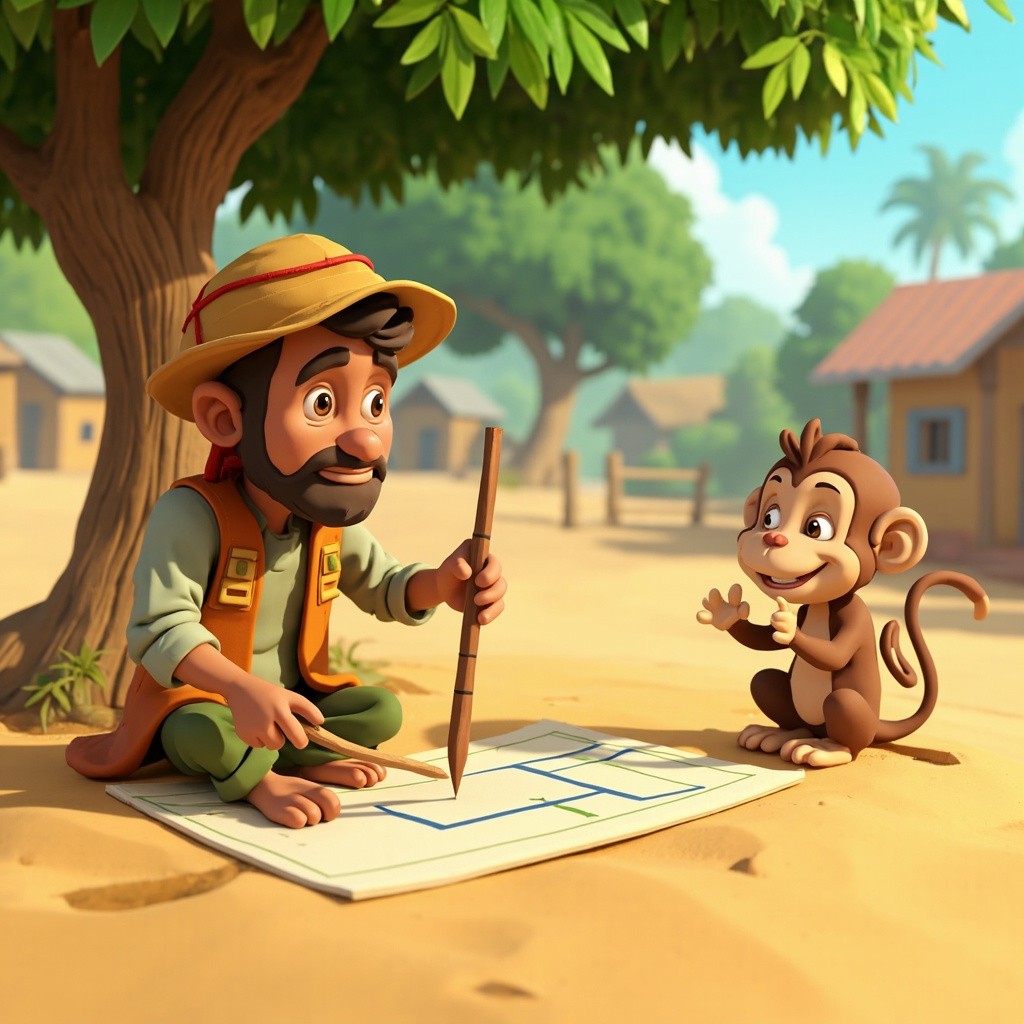 3D Cartoon Indian Farmer and Monkey Under Tree