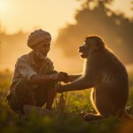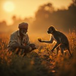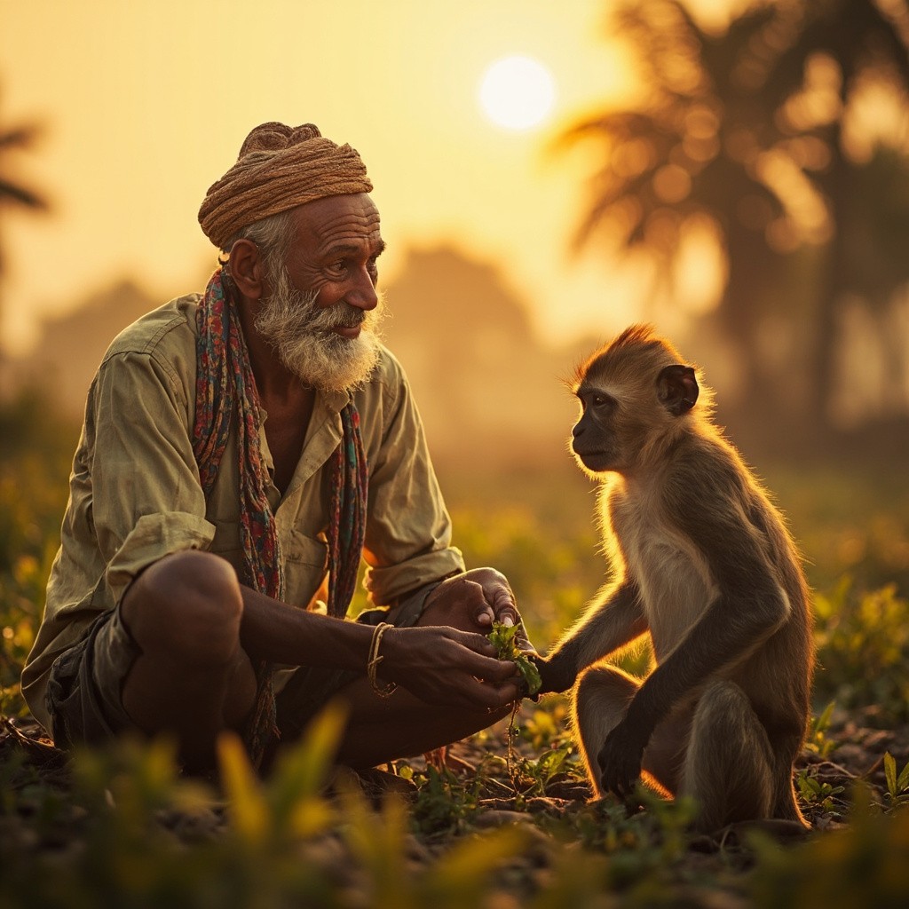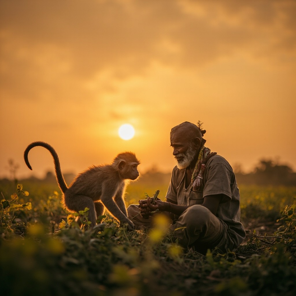 “Create a 30-second emotional AI video. Scene 1: A poor Indian farmer working hard in his small field under the hot sun, looking tired and worried. Scene 2: A playful monkey appears near the farm, watching the farmer with curiosity. Scene 3: The monkey helps the farmer by bringing fallen fruits and scaring away birds from the crops. Scene 4: The farmer smiles and shares food with the monkey. Scene 5: Both sit together at sunset, showing friendship and kindness. Style: Realistic, emotional, village background. Mood: Heart-touching, inspirational. Add soft background music and Hindi AI voice narration.”