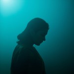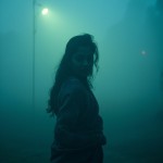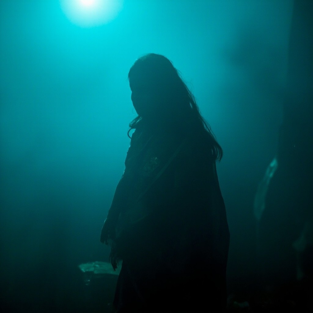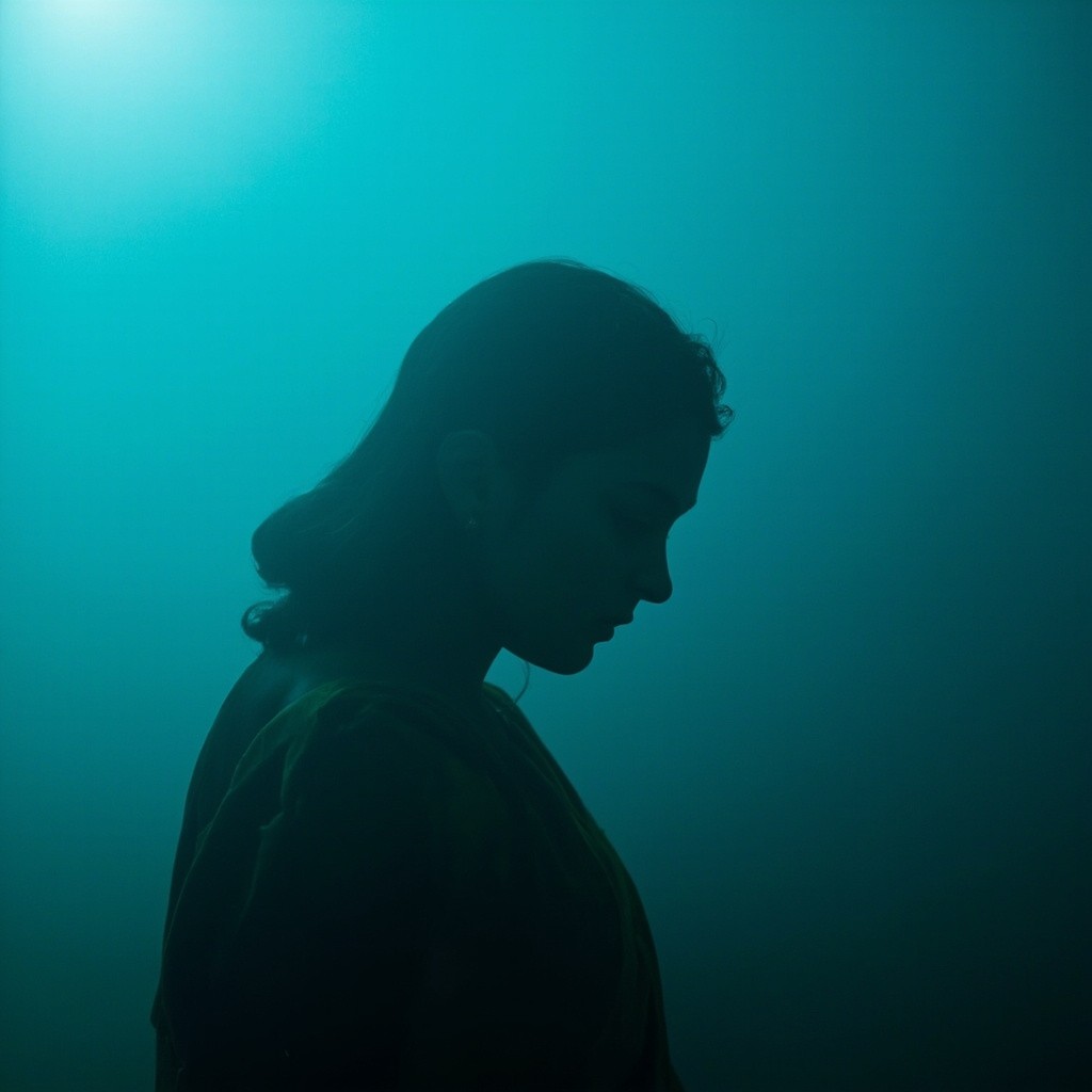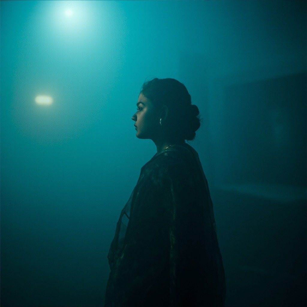 Indian Girl in Saree with Side Face Visible in Foggy Blue-Green Lighting