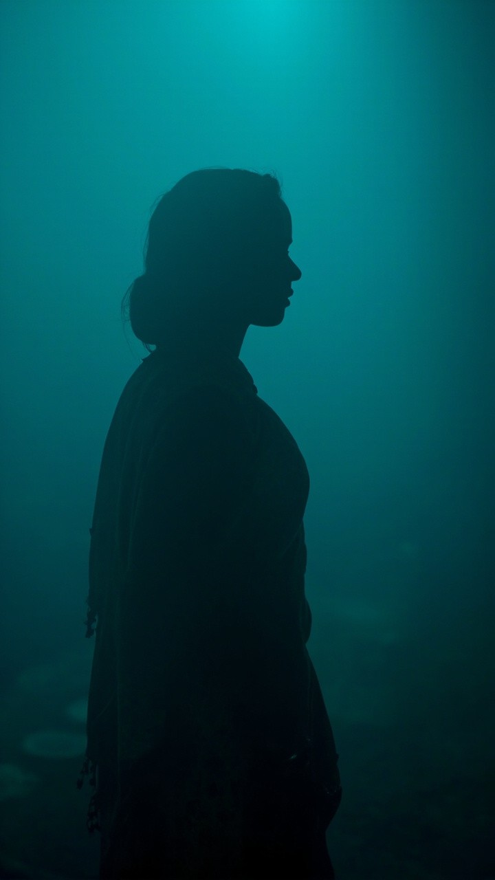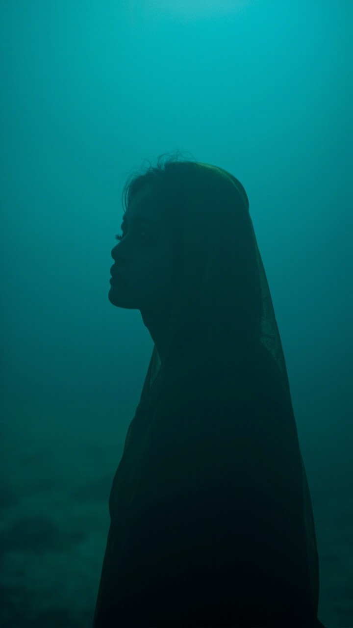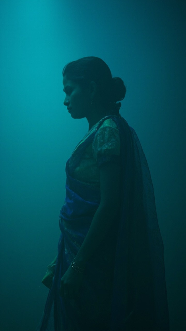 Side View of Indian Girl in Saree under Blue-Green Foggy Light