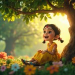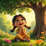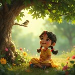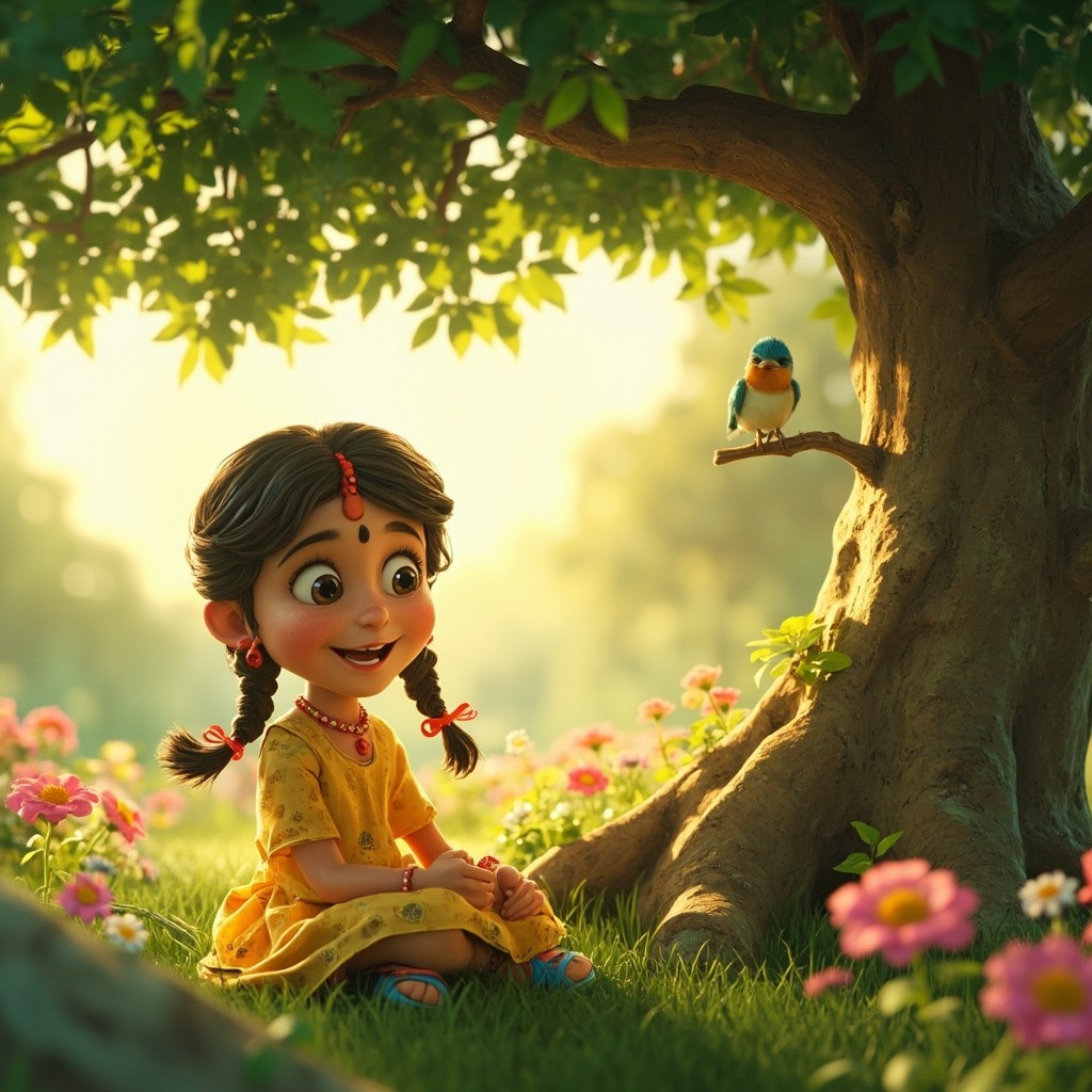 Indian Girl Singing Under Tree with Sparrow, 3D Cartoon