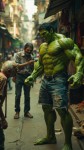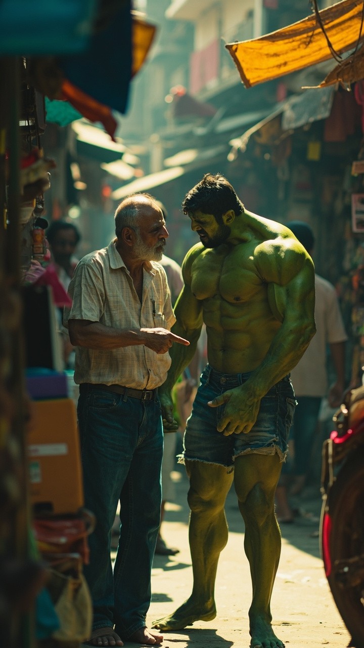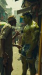 Indian Hulk Character in Crowded Street Market with Elderly Beggar and Shouting Shopkeeper