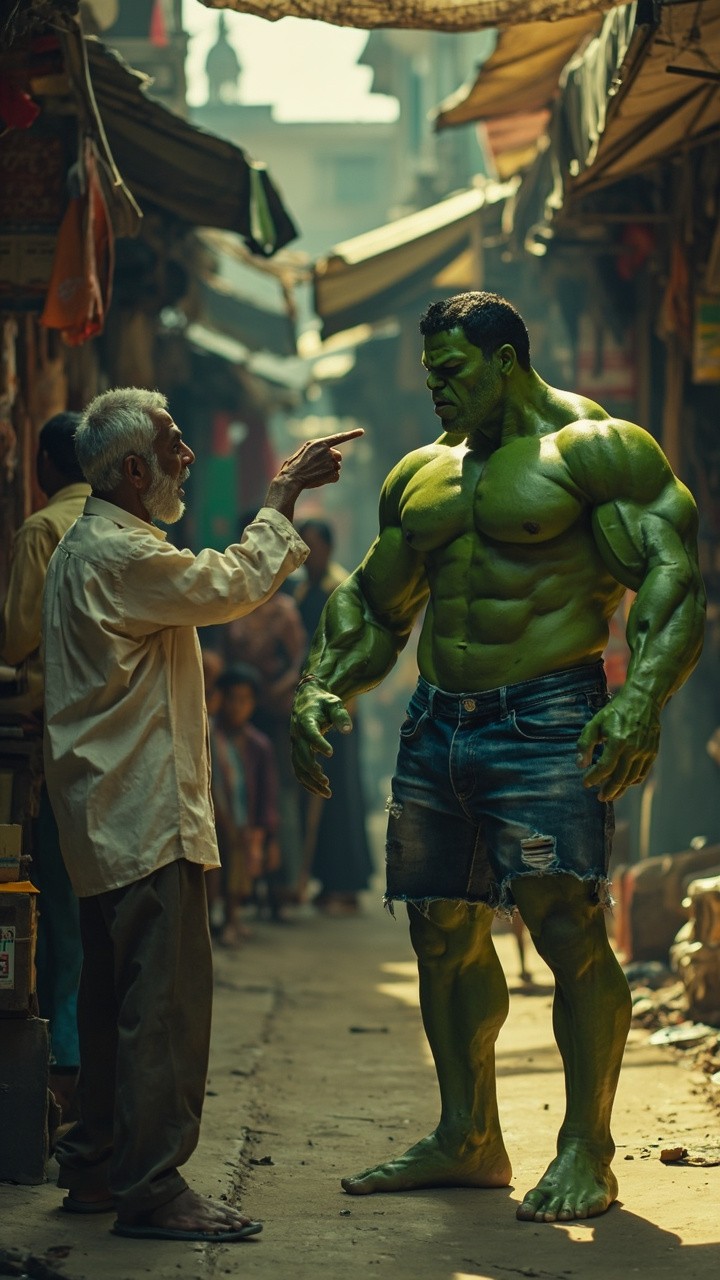 A cinematic 9:16 vertical shot in a crowded Indian street market. A rude shopkeeper is shouting at a weak, elderly beggar. Standing nearby is the main character: a realistic Indian male Hulk with extremely muscular bodybuilding physique, glowing green skin, and a calm but intense face. He is wearing torn denim shorts. The lighting is bright daylight, ultra-realistic 4K texture. The shopkeeper points aggressively at the beggar. Dialogue (lip-sync): এই বুড়ো, এখান থেকে যা! মানুষ ভয় পাচ্ছে তোকে দেখে।"
