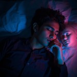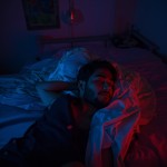 Indian Man Sleeping in Neon Lit Room with Golden Spirit Girl