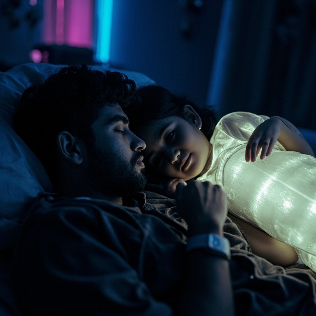A young Indian man lies on his bed at night, wearing dark night clothes. The room glows softly with neon blue and pink lights, creating a moody atmosphere. Beside him stands the glowing spirit of an Indian girl, her body emitting a gentle golden-white aura. She looks at him lovingly, with her hand placed softly on his cheek. A single tear rolls down from the man’s eye as he sleeps, feeling her presence without waking. The room around them is dim and quiet, filled with emotion and nostalgia. keep my face 100% same as in the
