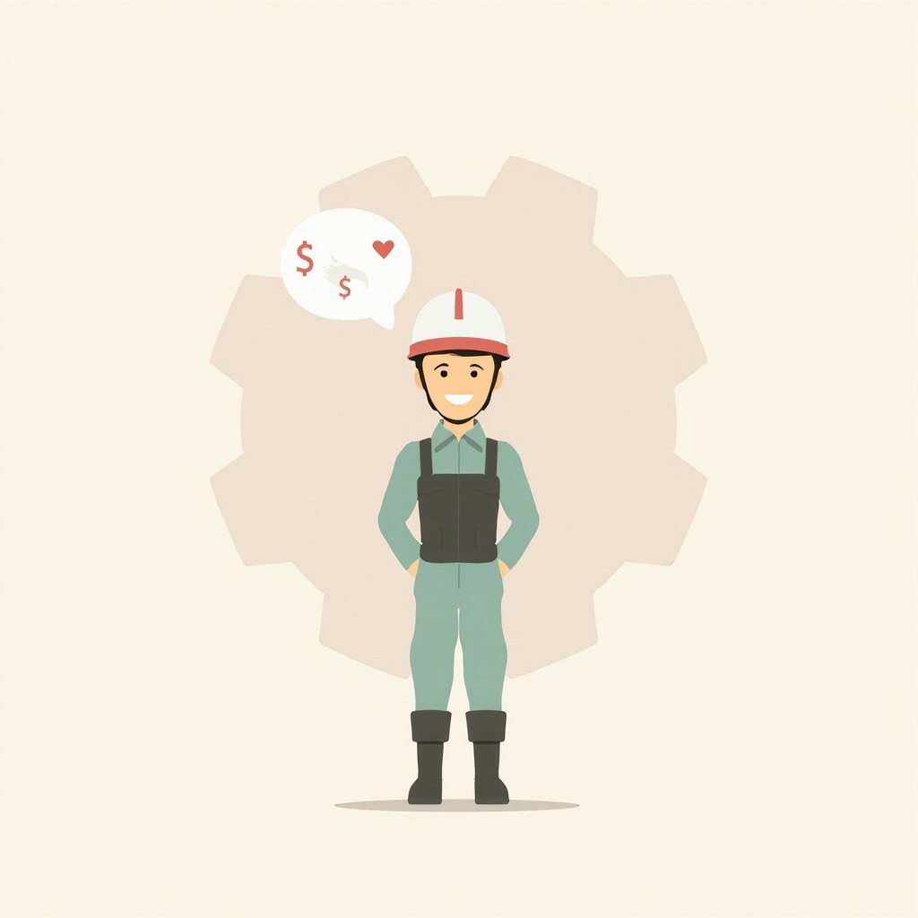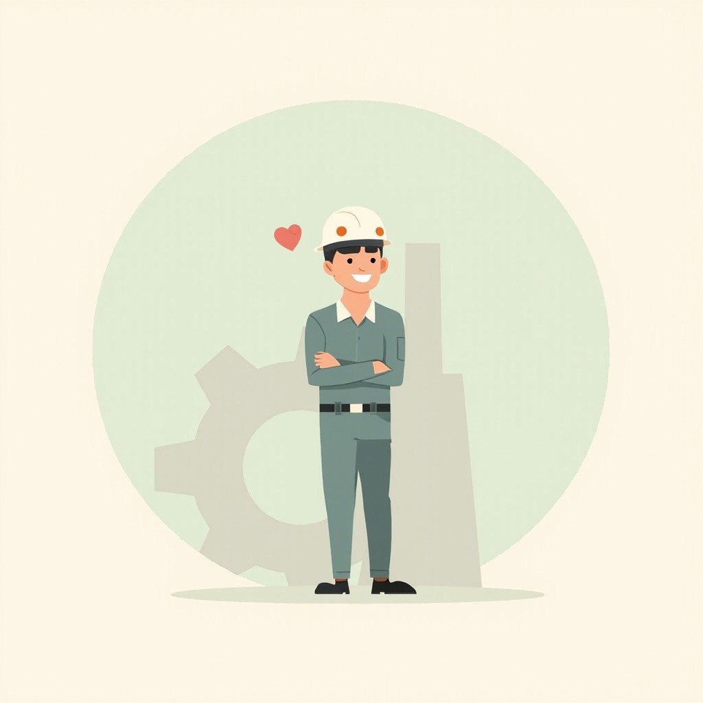 A single industrial worker in a minimalist helmet and factory uniform, standing confidently with a slight smile, semi-realistic but simplified. Pastel background (soft mint or blush) with ONE subtle large gear shape (translucent, low opacity). A tiny floating heart icon near the worker (symbolizing well-being). Ultra-clean composition, ample white space, muted colors, corporate vector art style. No clutter, no excessive details -- focus on symbolism and calm professionalism.