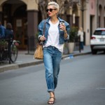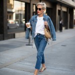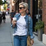 create an influencer woman walking in a city with one take-away coffee. the woman is over 35 with blonde short hair, red lipstick and aviator sunglasses. She is fit and wearing a white crew neck tee worn out. The tee has gathers un the side seam at bottom hem and is worn out over her jeans. She is wearing a idenim jacket with puff sleeves and worn open. She is wearing fitted straight jeans and sandals and straw bag and sun glasses. show her head to toe in city setting. show head to toe full shot.