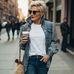 Influencer Woman Walking in City with Coffee, Sunglasses, and Denim Jacket