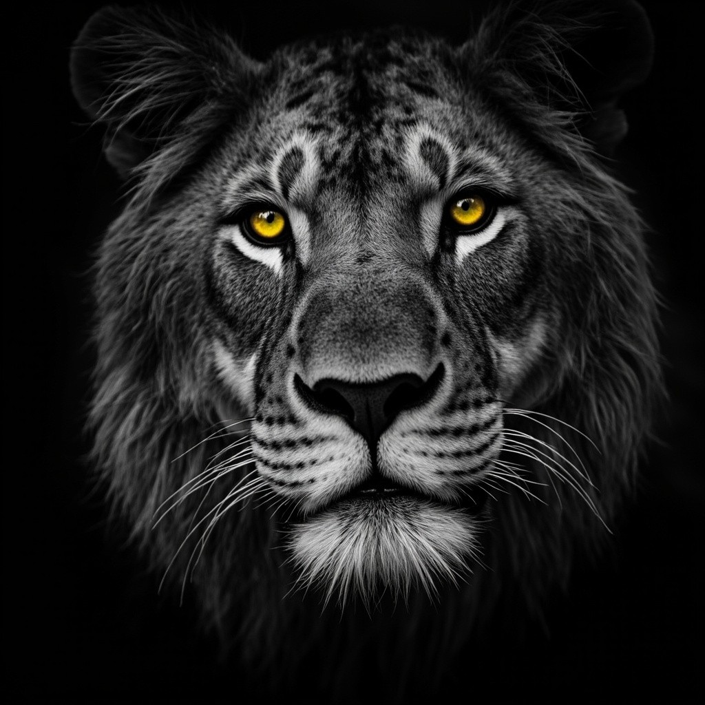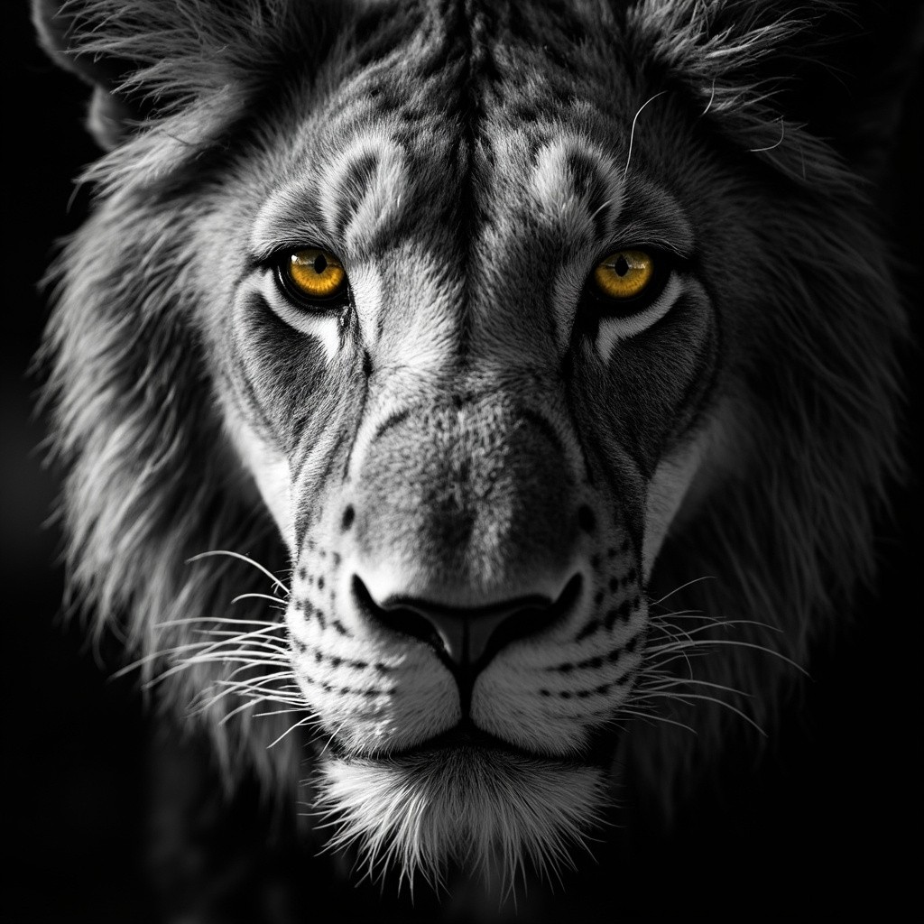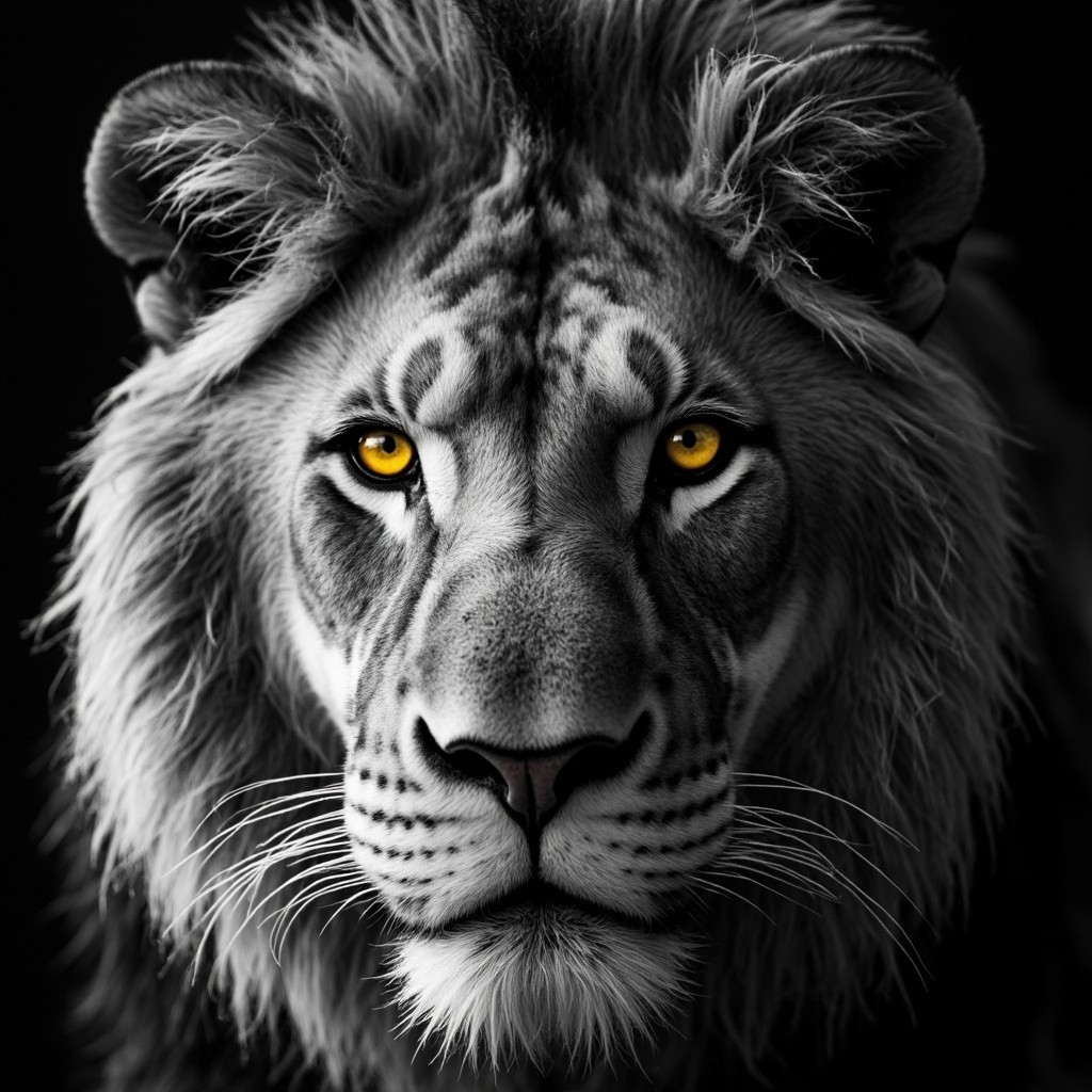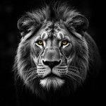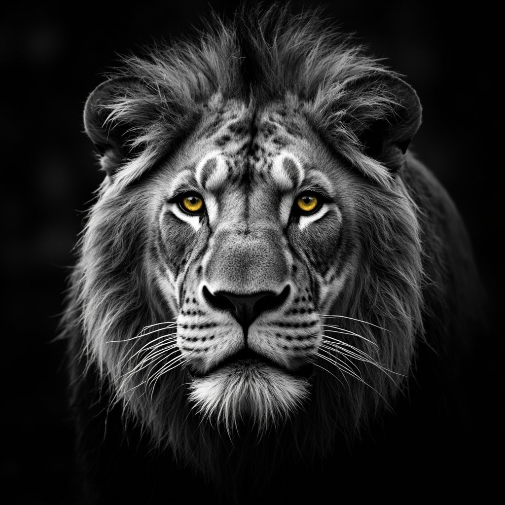 Close-Up Front View of Lion with Yellow Eyes in Black and White