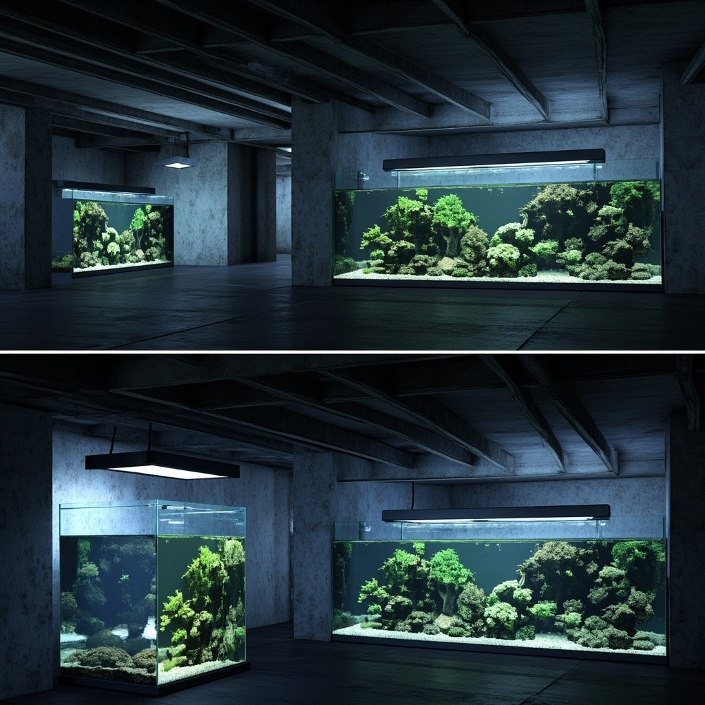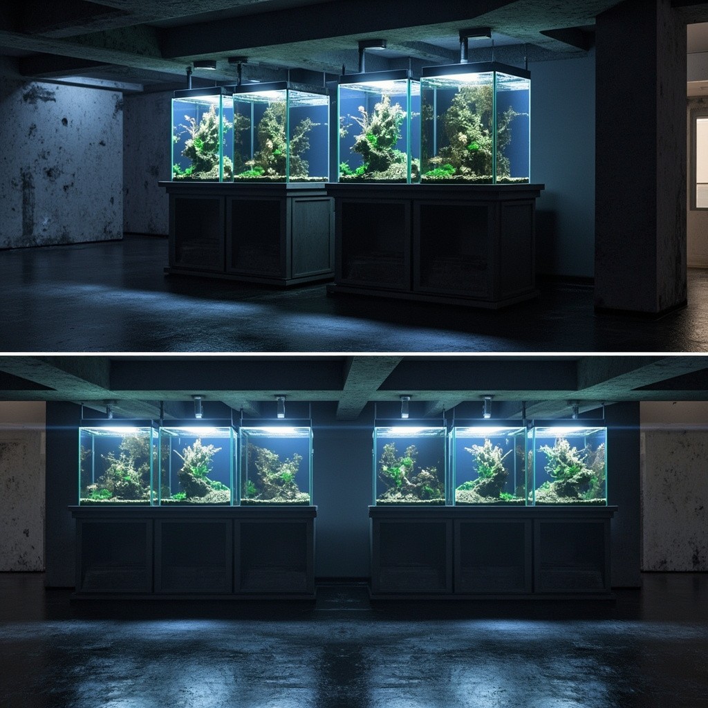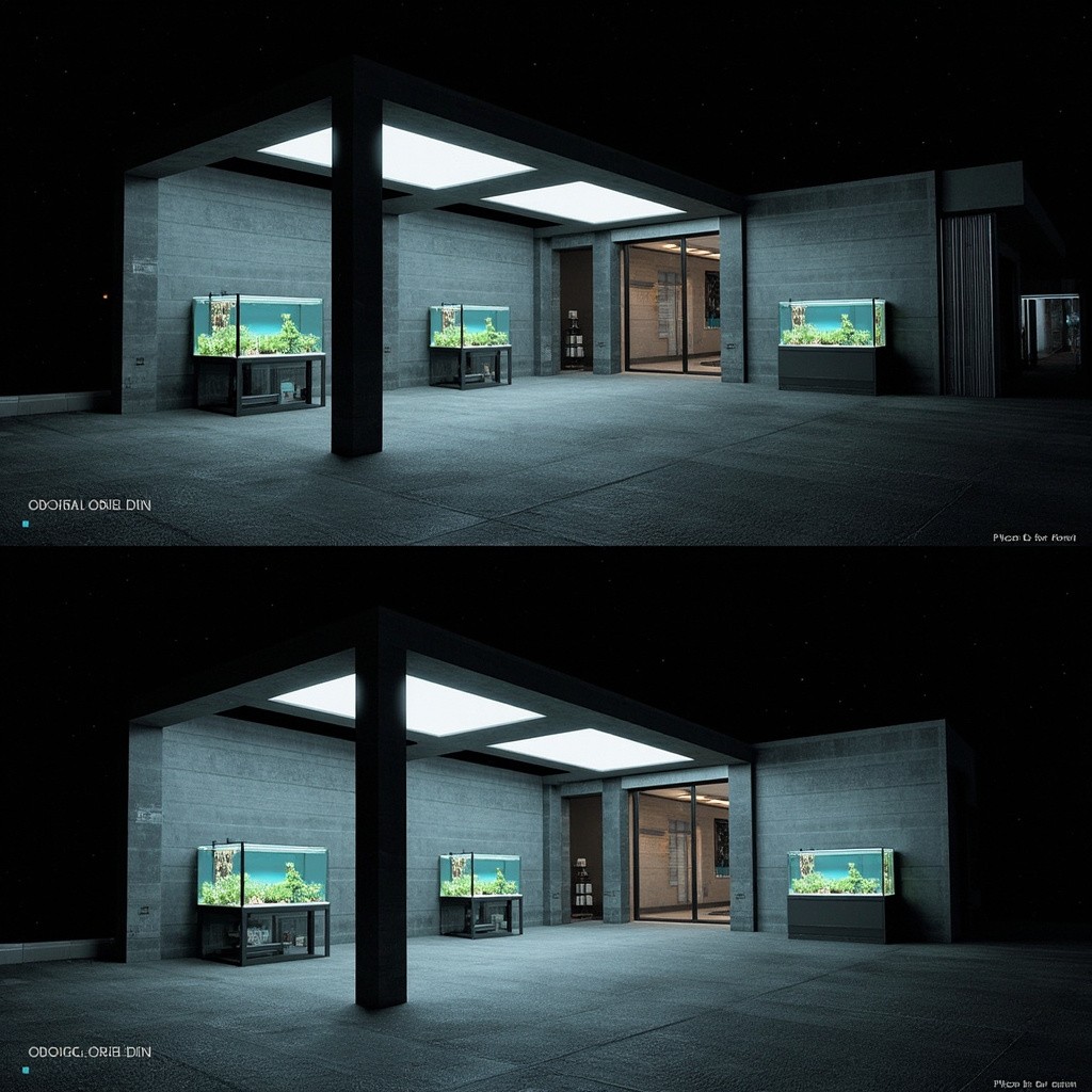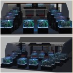 2D Interior View with Multiple Aquariums and Dark Low-Ceiling Floor