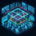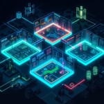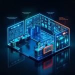 A high-tech isometric illustration of an integrated upstream oil and gas control room. The scene is divided into four glowing, semi-transparent team zones, each in a visually distinct box connected by glowing data lines and digital flows: Project Delivery Zone (UOA7) – Depicts a digital planning area with roadmap charts, task delivery pipelines, and project milestone trackers, suggesting seamless project transition before handover. Process Control Support Zone (UOA1) – Includes control loop diagrams, real-time optimization graphs, PID tuning dashboards, and performance analytics, representing centralized process control excellence. Process Automation System Services Zone (UOA3) – Showcases advanced automation systems like DCS layouts, programmable controllers, system integration icons, and data flow between equipment blocks. HMI in IOC Zone (UOA4) – Features modern HMI screens, symbol-driven dashboards, digital twin interfaces, and intuitive controls showing the bridge between human and machine interaction. All zones are connected within a futuristic digital control room with server racks, data pipelines, and oil and gas facility feeds (like wellhead icons, pipeline sensors, offshore rig diagrams) displayed on large transparent screens. Use glowing blue, green, and red accents. No text, no human figures. Emphasize spatial clarity, system integration, and upstream operations. Style is isometric with modern lighting and collaborative energy.