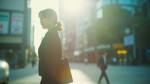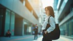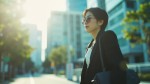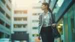 Japanese Businesswoman Walking in Urban Office District with Modern Buildings Background