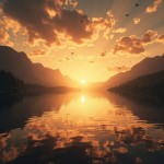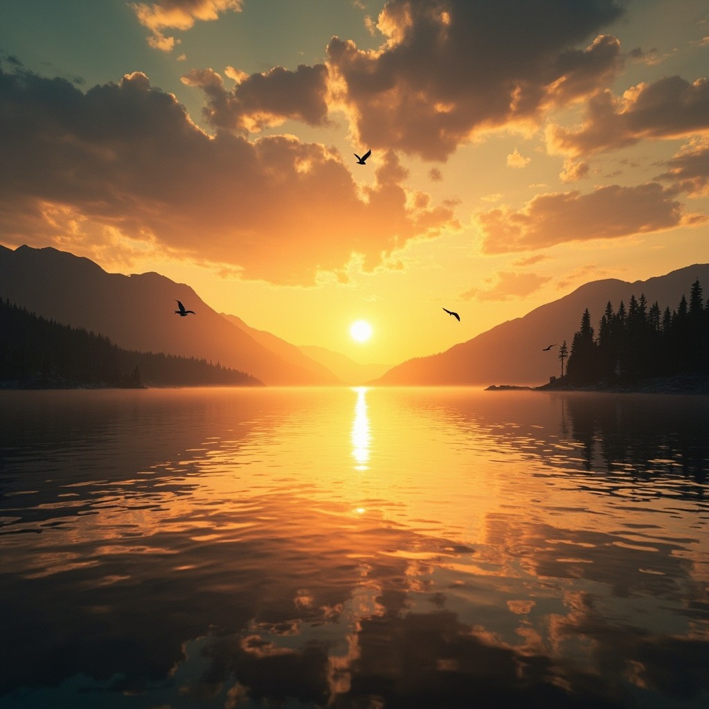 Beautiful Sunset Over Calm Lake with Mountain Background and Birds in Sky