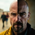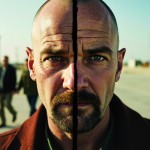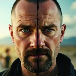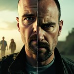 Create a picture with a line from top to bottom in the middle of the picture. On the left is the left half of Jesse Pinkman's face in the second season of "Breaking Bad", which looks very lively and uninhibited, with his girlfriend Jane in the background and Walter White in the distance. The right half of the picture is the right half of Jesse Pinkman's face who escaped to Alaska in the last season, which looks very lonely and tired, but also has a glimmer of hope for a new start. The faces on both sides of the picture are stitched together to form a complete Jesse