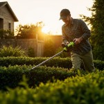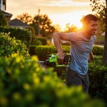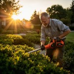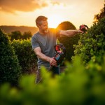 Man Shaping Garden Bushes with Cordless Hedge Trimmer at Sunrise