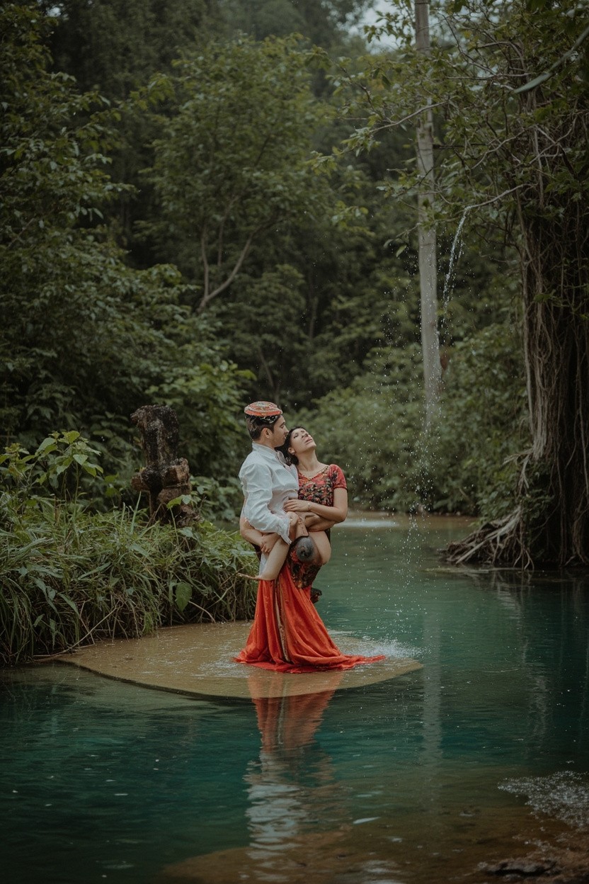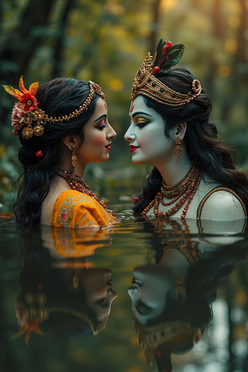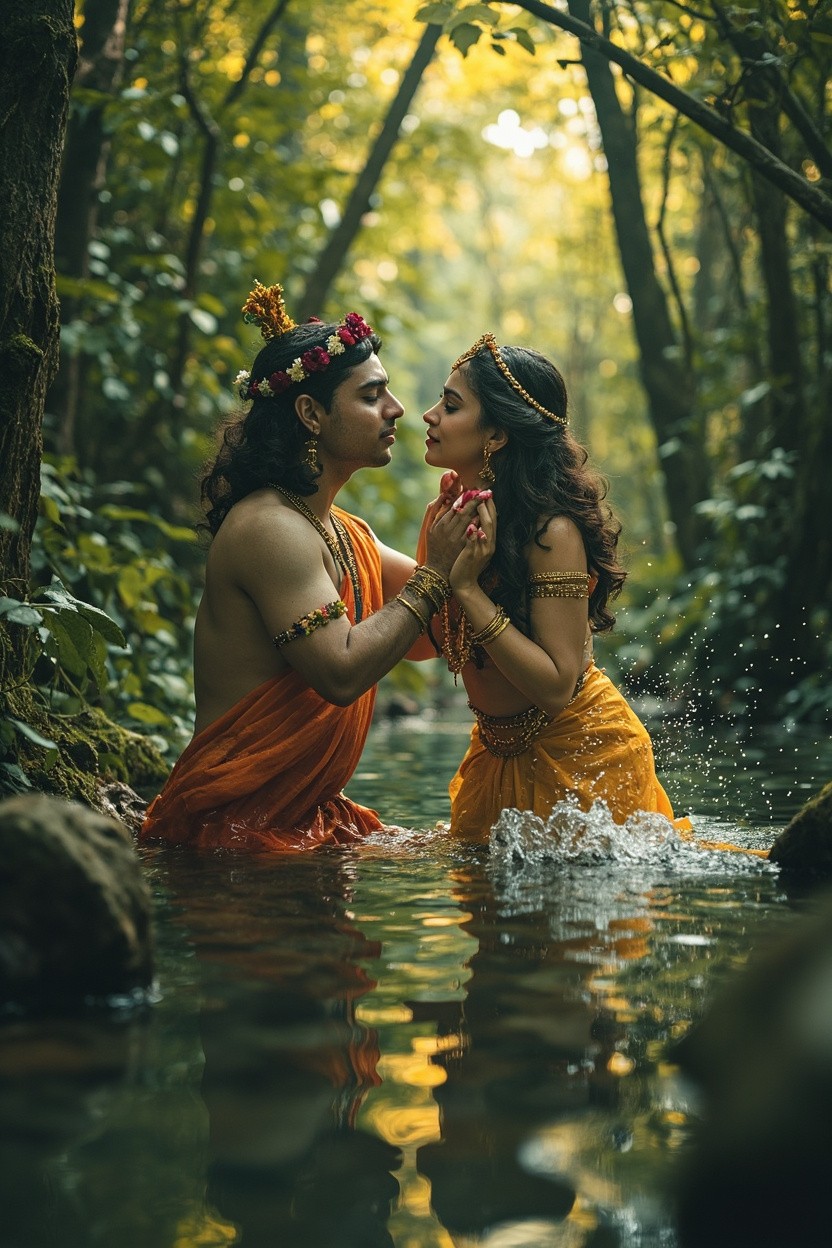 Krishna and Radha Love in Forest Water