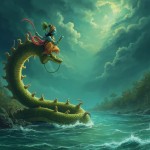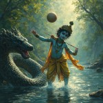 एक बार की बात है, गोकुल के पास बहने वाली यमुना नदी में एक भयानक नाग रहता था, जिसका नाम था कालिया नाग। उसके ज़हर से नदी का पानी काला और जहरीला हो गया था। कोई भी उस पानी को पीने की हिम्मत नहीं करता था। एक दिन खेलते-खेलते कृष्ण के दोस्त गेंद को यमुना में गिरा बैठे। सब डर गए, लेकिन कृष्ण बिना डरे नदी में कूद गए। नदी के अंदर कालिया नाग ने कृष्ण पर हमला किया। लेकिन श्रीकृष्ण ने बड़ी बहादुरी से उसका सामना किया और उसके फनों (सिरों) पर चढ़कर नृत्य करने लगे! 🕺 कृष्ण के दिव्य रूप को देखकर कालिया नाग डर गया और हार मान ली। उसने कृष्ण से माफी मांगी और वचन दिया कि वह यमुना छोड़कर चला जाएगा। कृष्ण ने उसे माफ कर दिया और यमुना नदी फिर से साफ और सुरक्षित हो गई।