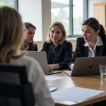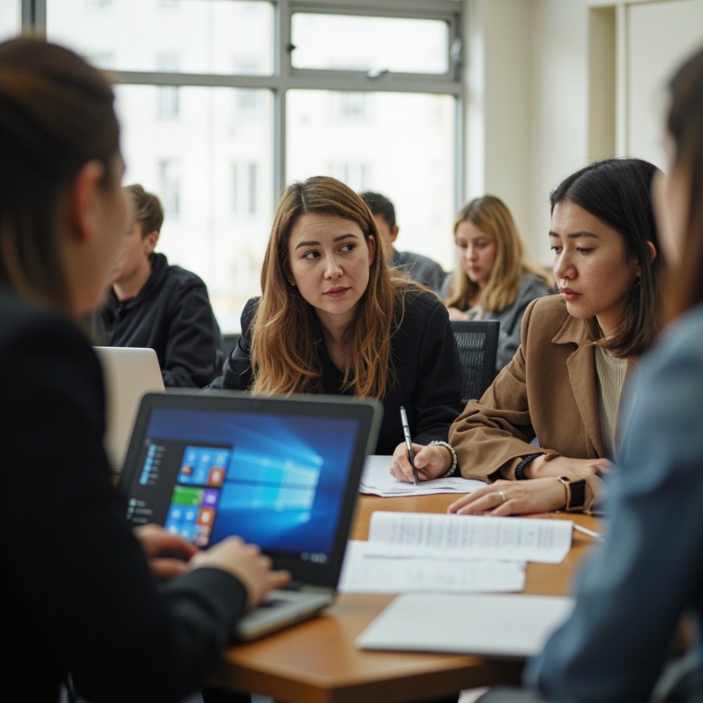 Kyrgyz Teachers in Professional Meeting with Laptops in Bright Classroom