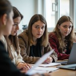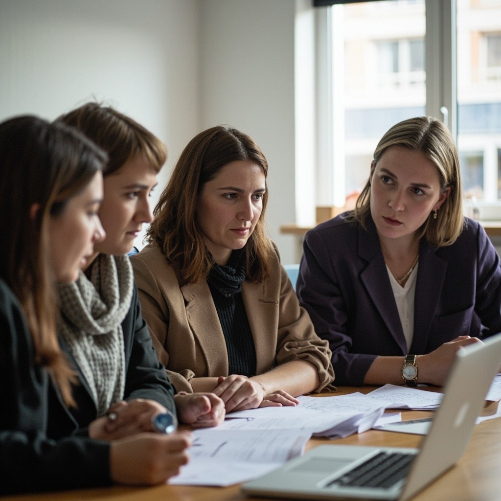 Realistic photo of Kyrgyz teachers during a meeting. A group of Central Asian school teachers sitting around a table, discussing documents, laptops open, professional environment, bright classroom, natural lighting, mixed ages, respectful and focused expressions, modern education setting. Suitable for a news article about launching IT courses for teachers in Kyrgyzstan.